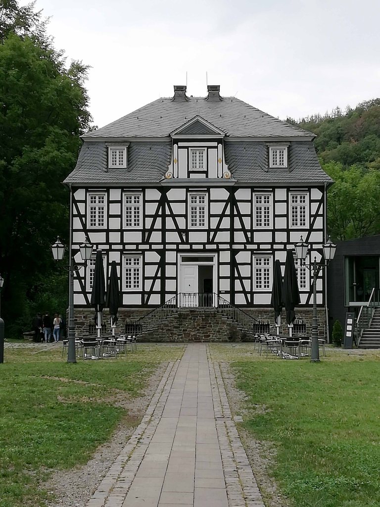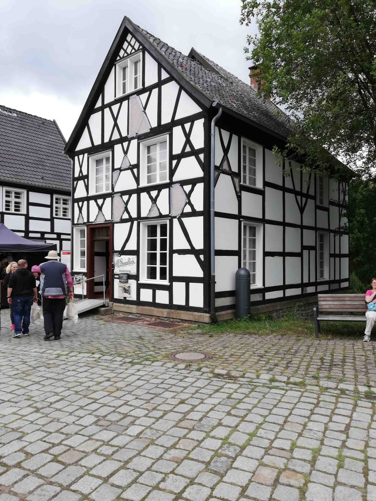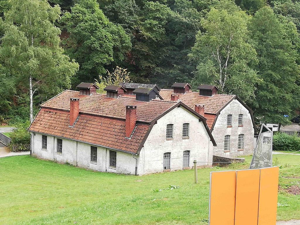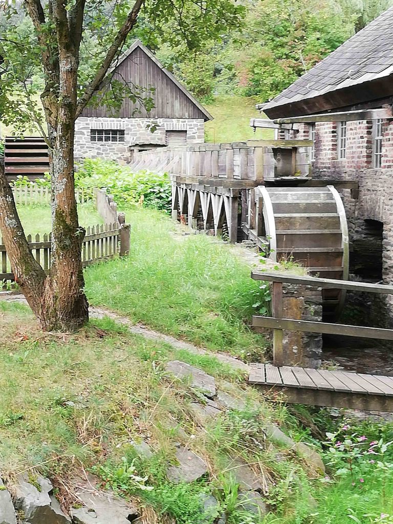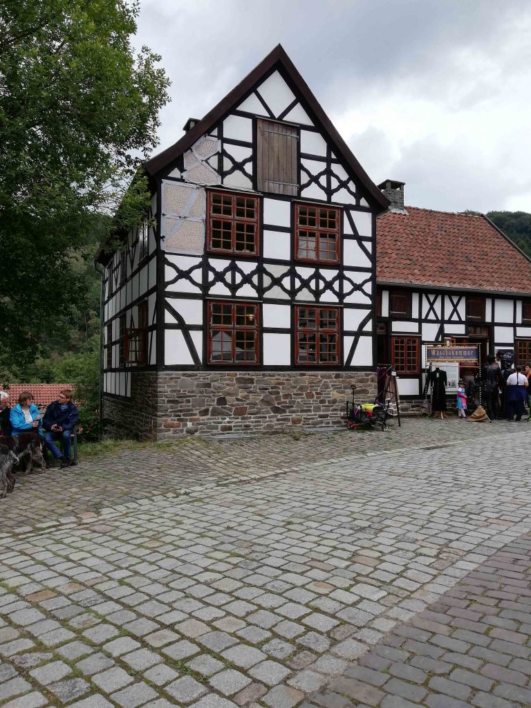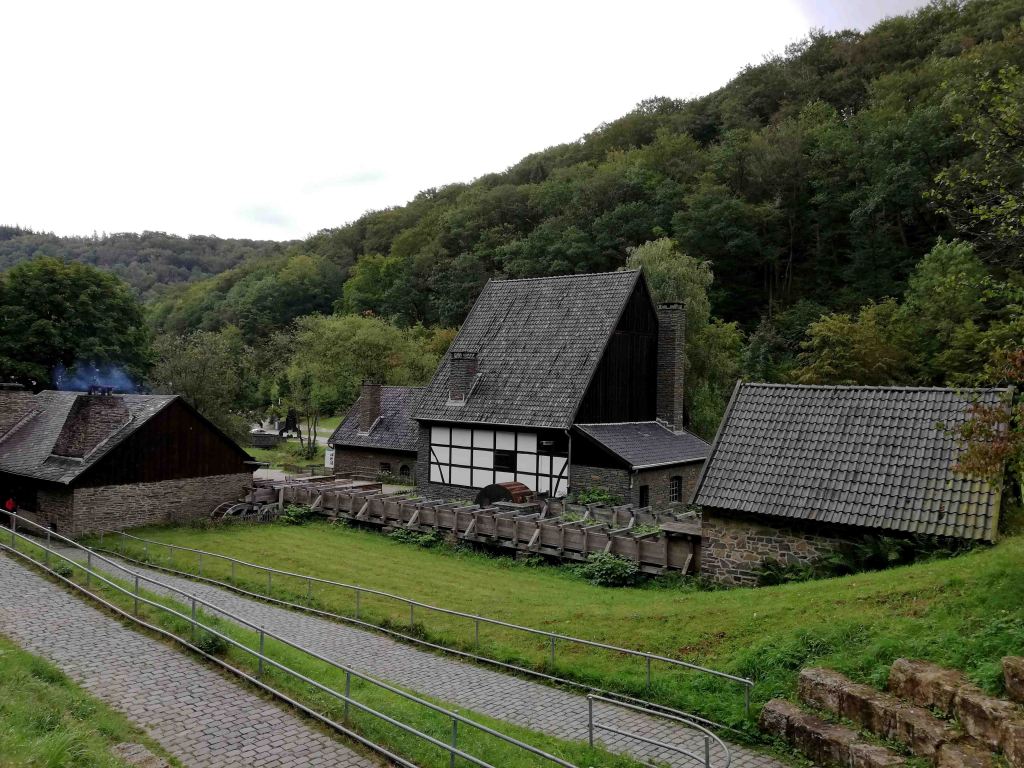 Nach dem Eingang erstreckt sich das Gelände sehr weitläufig und bergig und einem Parcours von 80 Höhenmeter muss durch das Ensemble von Handwerk- und Gewerbebetrieben des 19. und des frühen 20.Jahrhundert durch den Wald überwunden werden. Gleich am Anfang der ersten Steigerung ist der Weg sehr uneben mit Kopfsteinpflaster versehen. Ich beobachtete einen Nicht-E-Rolli-Fahrer, der von seiner Begleitperson hinaufgeschoben wurde, dass er viel Kraft brauchte und die Räder sich in dem Kopfsteinpflaster verkanteten. Hier wird es auch für Rollator; Ältere und Gebehinderte sehr schwer diese Meter zu bewältigen. Auf dem weiteren Weg das Tal hinauf kommen viele schöne Gebäude und Werkstätten und die Wege sind unterschiedlich von Asphalt, Kies und Kopfsteinpflaster versehen. Manche Erhebungen sind fast nicht für schwer Gebehinderte oder schiebende Rollstuhl/Rollator Fahrer zu schaffen.