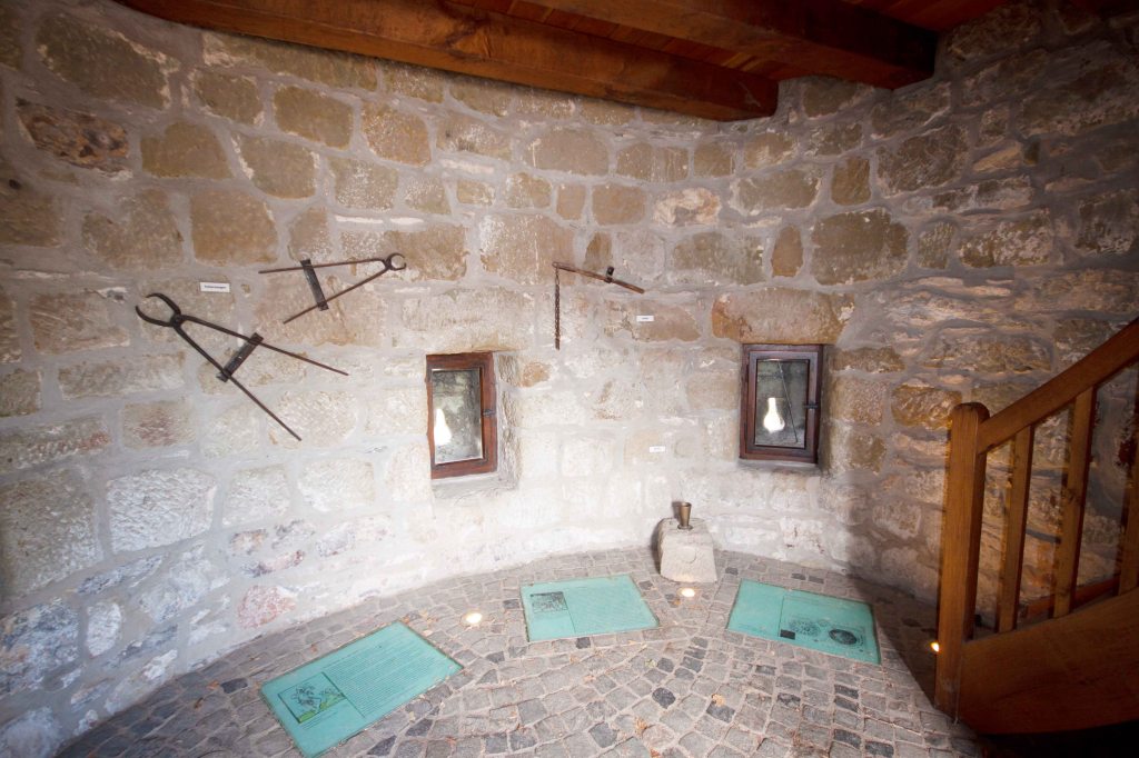 Betritt man das mittelalterliche Gebäude befinden sich kleine Schießscharten und damalige üblichen Verhörinstrumente an den Wänden, zum Beispiel Foltergeräte, wie eine Daumenschraube, eine eiserne Folterzange und ein Richtschwert. Beleuchtete Informationstafeln zur geschichtlichen Hexenverfolgung sind im Boden eingelassen. Ins Obergeschoß gelangt man über eine schmale Holztreppe, dort hängen an den Wänden eine alte Rute und eine Halsfessel. Weiterhin befindet sich hier ein sogenannter „Aufzug“ – eine Schlinge, die an einem schweren Stein befestigt ist. Und ein hölzerner Folterstuhl.