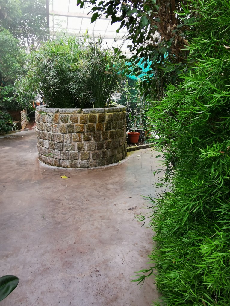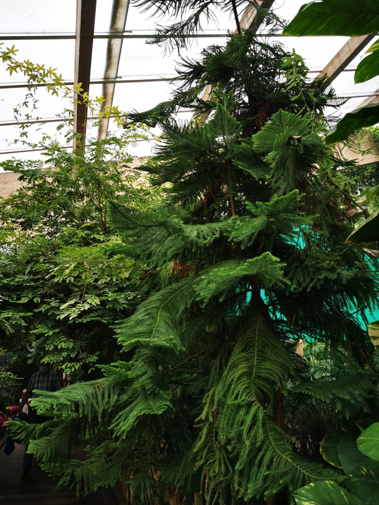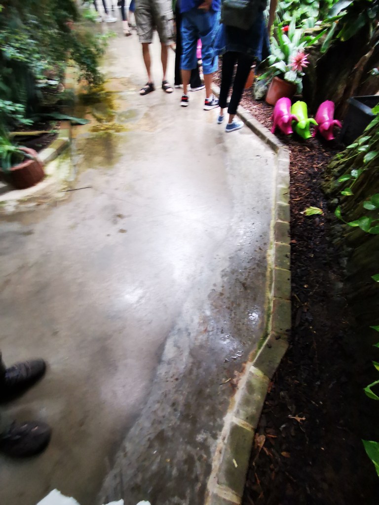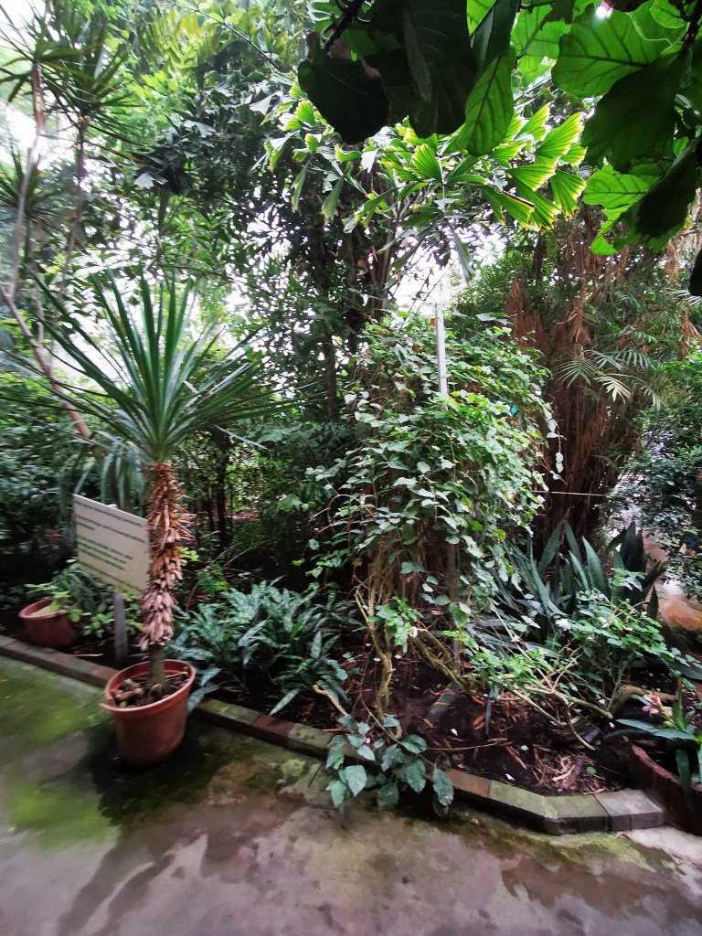 Der Eingang ist breit und ebenerdig gestaltet und ermöglicht einen barrierefreien Zugang, obwohl die Tür etwas schwer zu öffnen war. Die Gänge in der Tropenhalle sind angenehm breit und optimal für Rollatoren und Rollstühle geeignet. Es ist jedoch wichtig, aufgrund der hohen Luftfeuchtigkeit und der ständig besprühten Pflanzen beim Laufen vorsichtig zu sein, da der Boden manchmal glatt sein kann. Brillen könnten ebenfalls beschlagen.