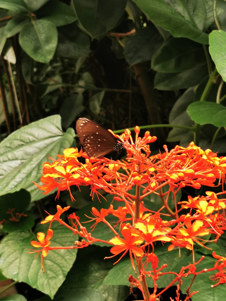 Die Schmetterlingsfarm beherbergt ein naturnahes Biotop mit einer Vielzahl von exotischen Pflanzen, Papageien, Riesenschildkröten, Vogelspinnen, Skorpionen und anderen faszinierenden Insekten. Insgesamt gibt es etwa 2000 Schmetterlinge aus 60 verschiedenen Arten, obwohl es mir manchmal so vorkam, als müsste ich etwas genauer suchen, um sie zu entdecken.
