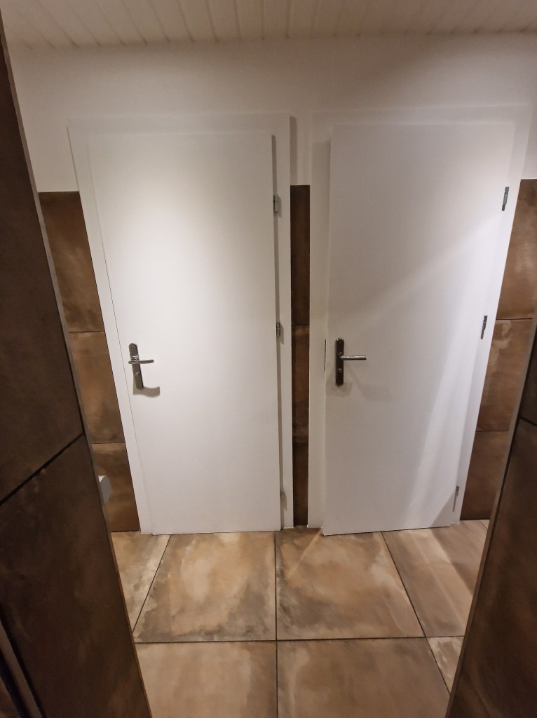 Das Innere des Restaurants hingegen bot viel Platz, was die Bewegungsfreiheit erleichterte. Die Toiletten für Männer und Frauen waren auf derselben Ebene, was eine angenehme Zugänglichkeit gewährleistete. Allerdings war die Damentoilette in zwei separate Toiletten und ein Waschbecken unterteilt, wobei die Türbreite bei etwa 72 cm lag. Dies könnte für größere Rollstühle problematisch sein.