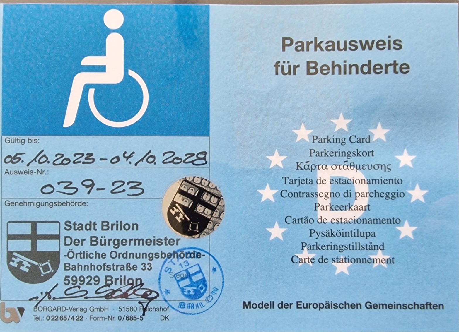 • Mit einem Behindertenparkausweis dürfen auf ausgewiesene Behindertenparkplätze geparkt werden.