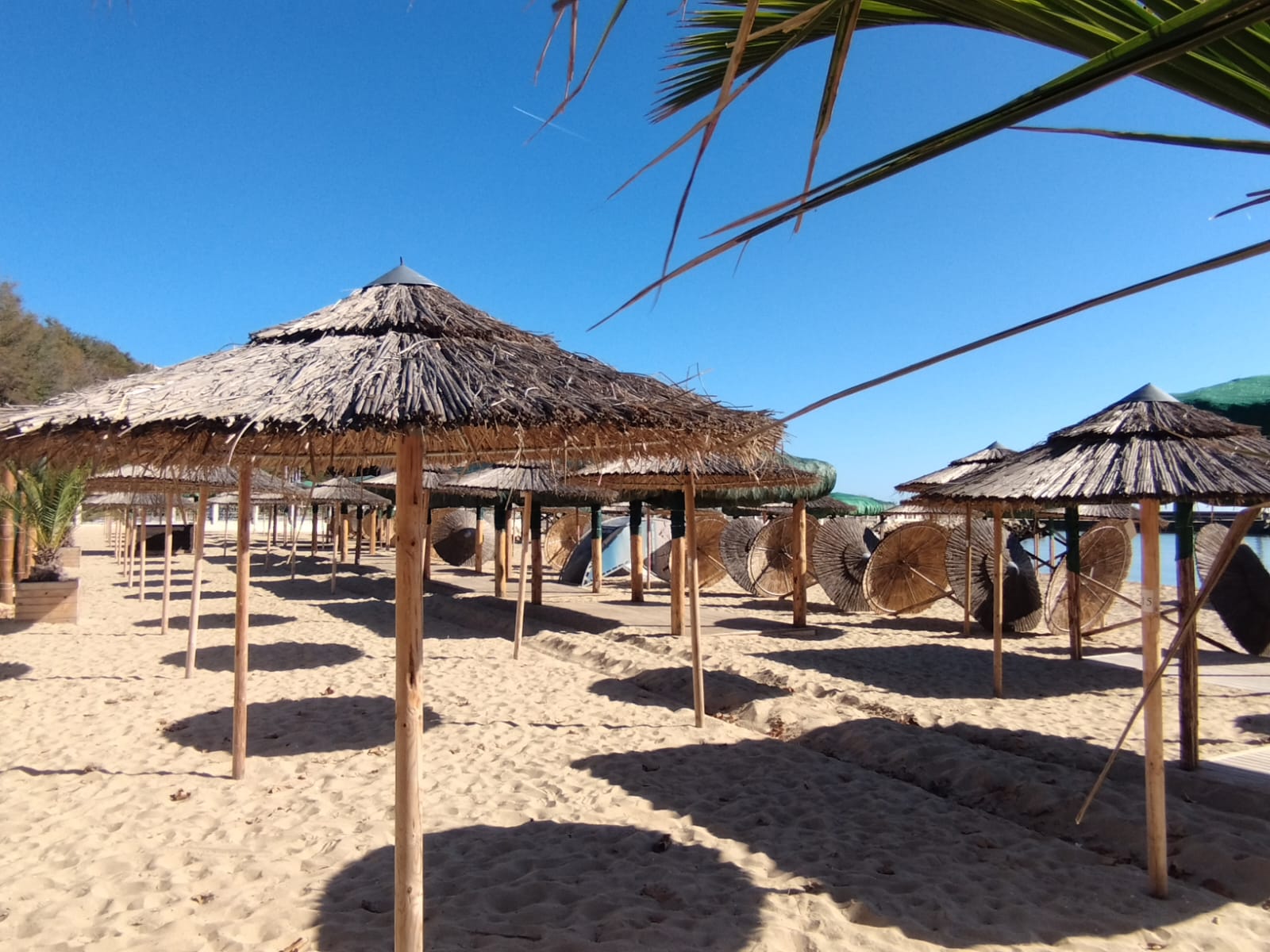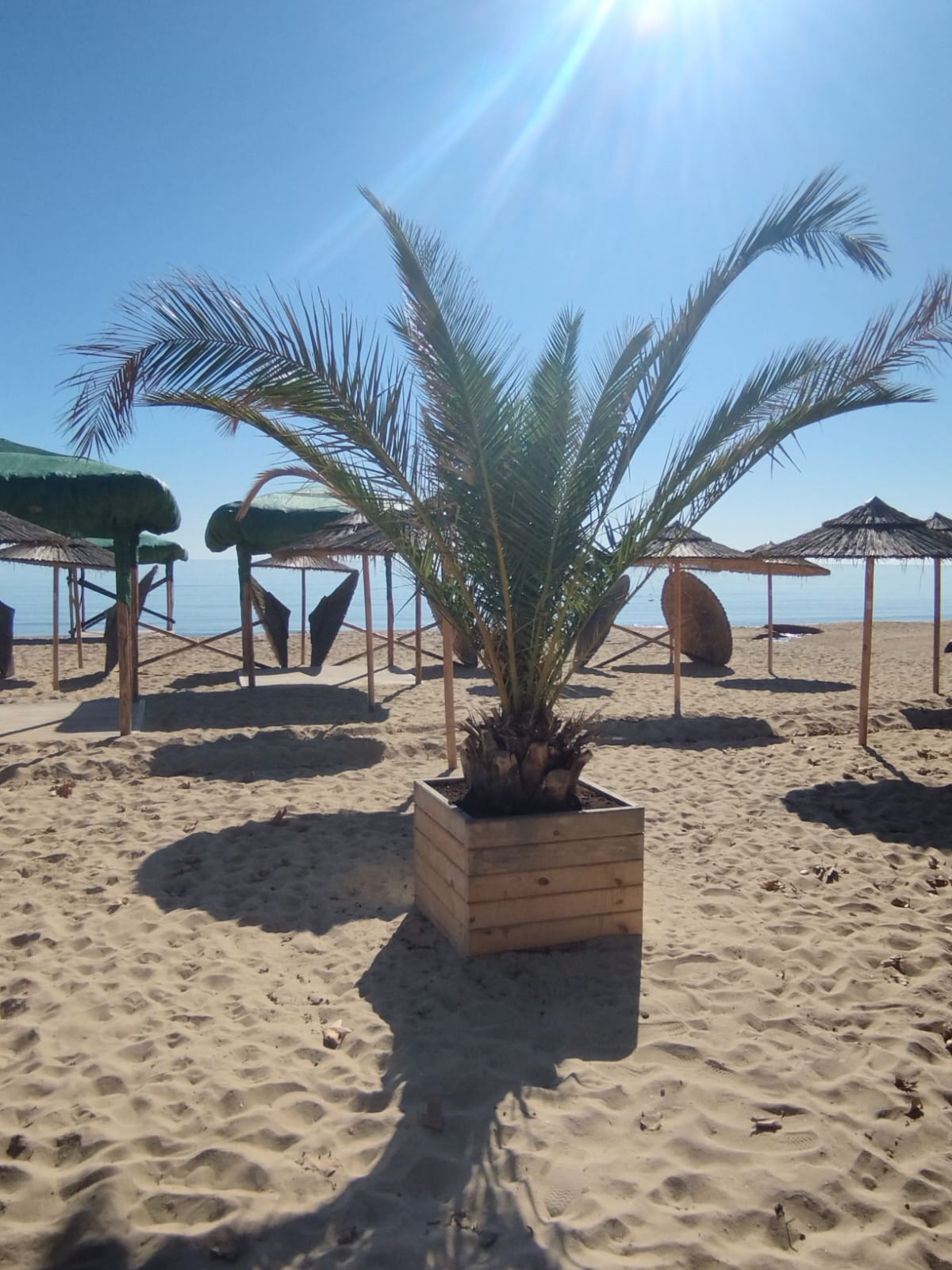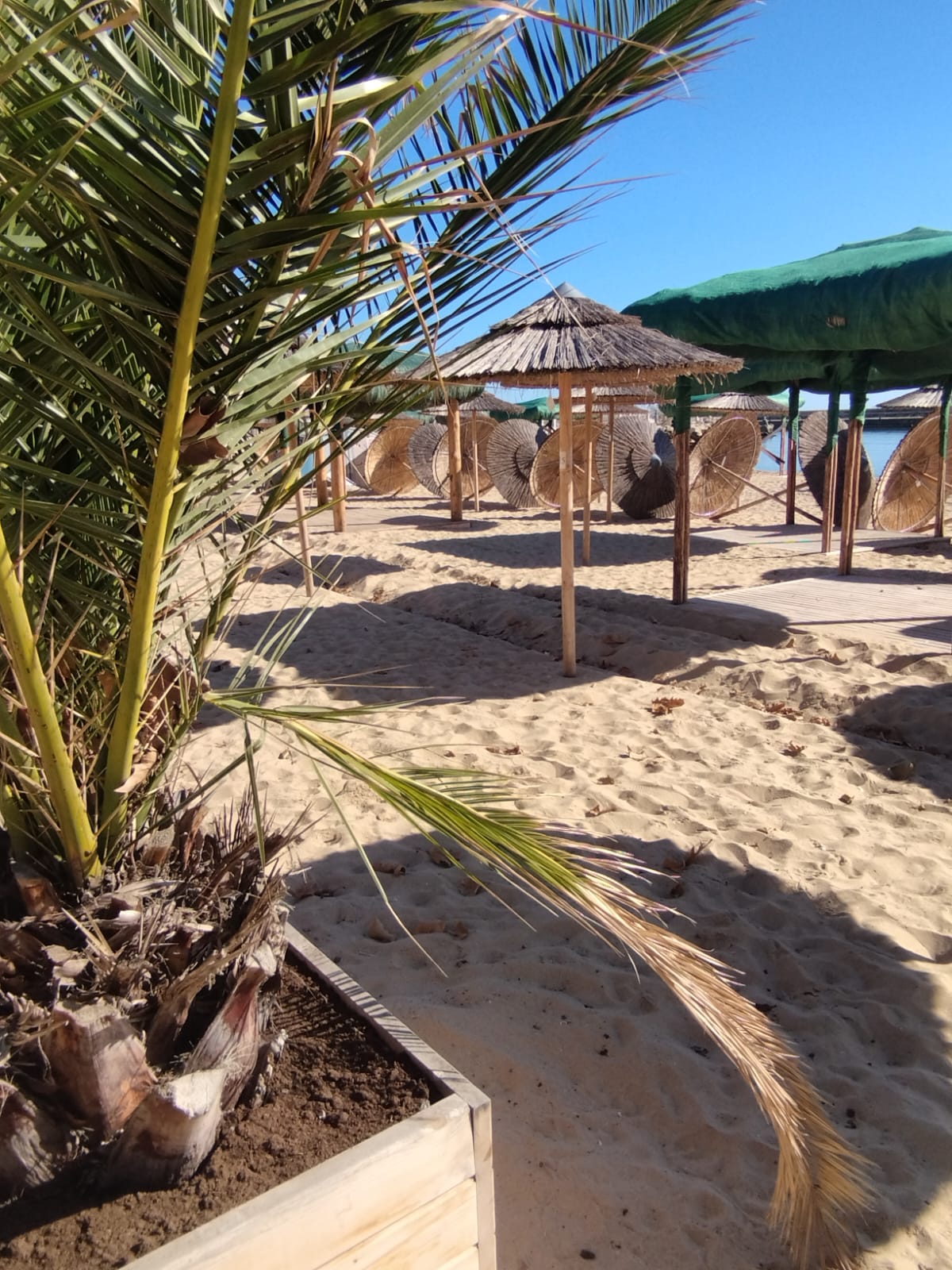 Am Strand selbst erwartet die Besucher ein idyllisches Bild: Zwischen den charmanten Strohschirmen stehen Palmen in großen Gefäßen, die für ein exotisches Flair sorgen. Diese einzigartige Atmosphäre lädt zum Abschalten und Genießen ein. Die Sonnenliegen am Pool und am Strand sowie die eleganten, weißen Sonnenschirme stehen allen Gästen inklusive zur Verfügung – je nach Verfügbarkeit. Das flach abfallende Wasser bietet zusätzlich sicheren und bequemen Zugang, ideal für Familien und alle, die das Meer in vollen Zügen genießen möchten.