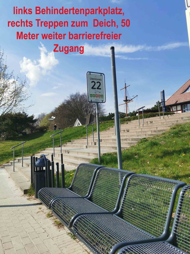 Der angrenzende Bürgersteig davor war relativ hoch und uneben – ein echtes Hindernis für mich mit meinem Rollstuhl. Der Übergang vom Parkplatz zum Deich hätte barrierefreier, fließender und sicherer gestaltet sein können.