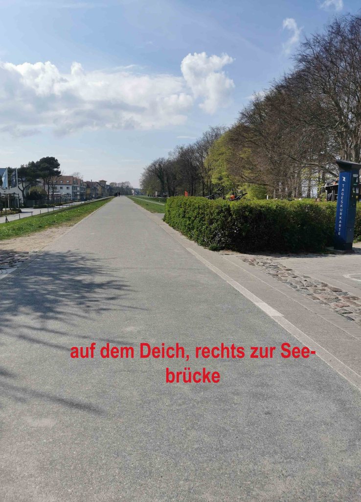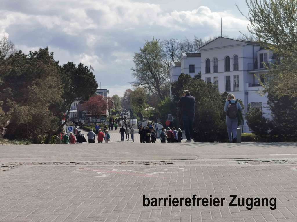 Der Aufstieg zum Kurhaus und den charmanten Restaurants auf dem Deich verlief dann erfreulicherweise barrierefrei über einen geteerten, teilweise sehr gut gepflasterten Weg. Strandaufgang Nr. 12. Der gepflegte, breite Weg wirkte einladend und ermöglichte mir, entspannt bis zur Seebrücke zu rollen.
