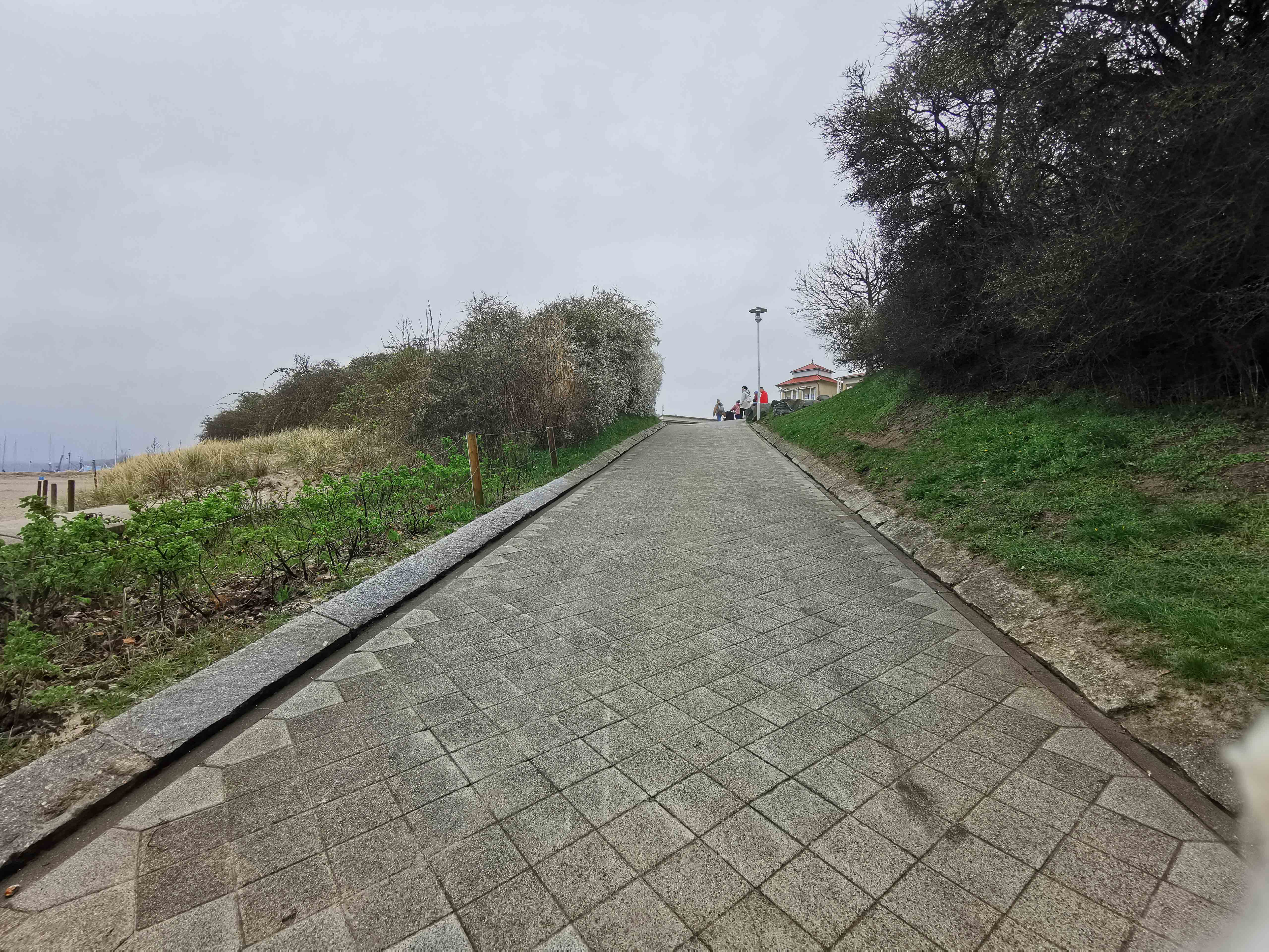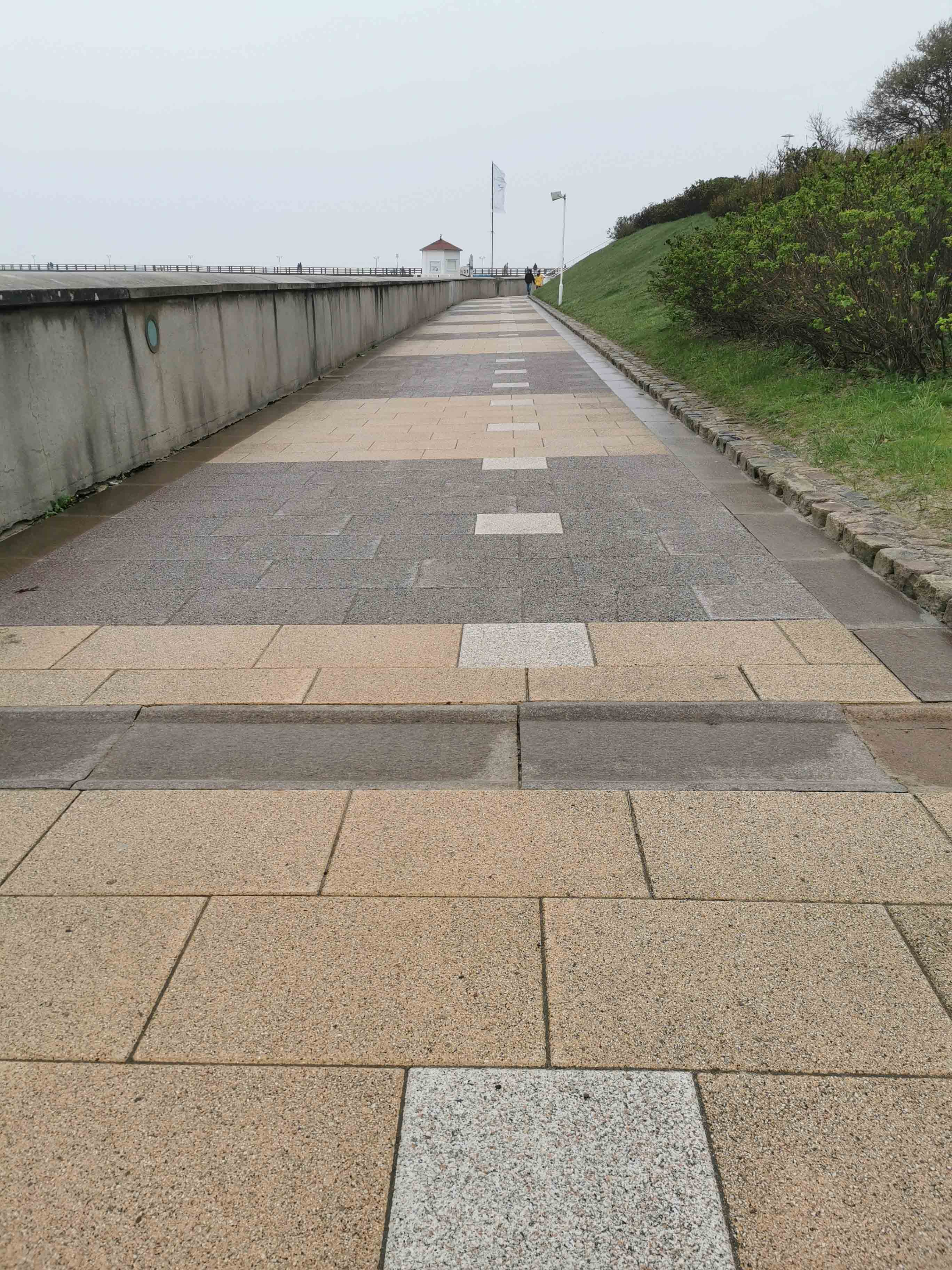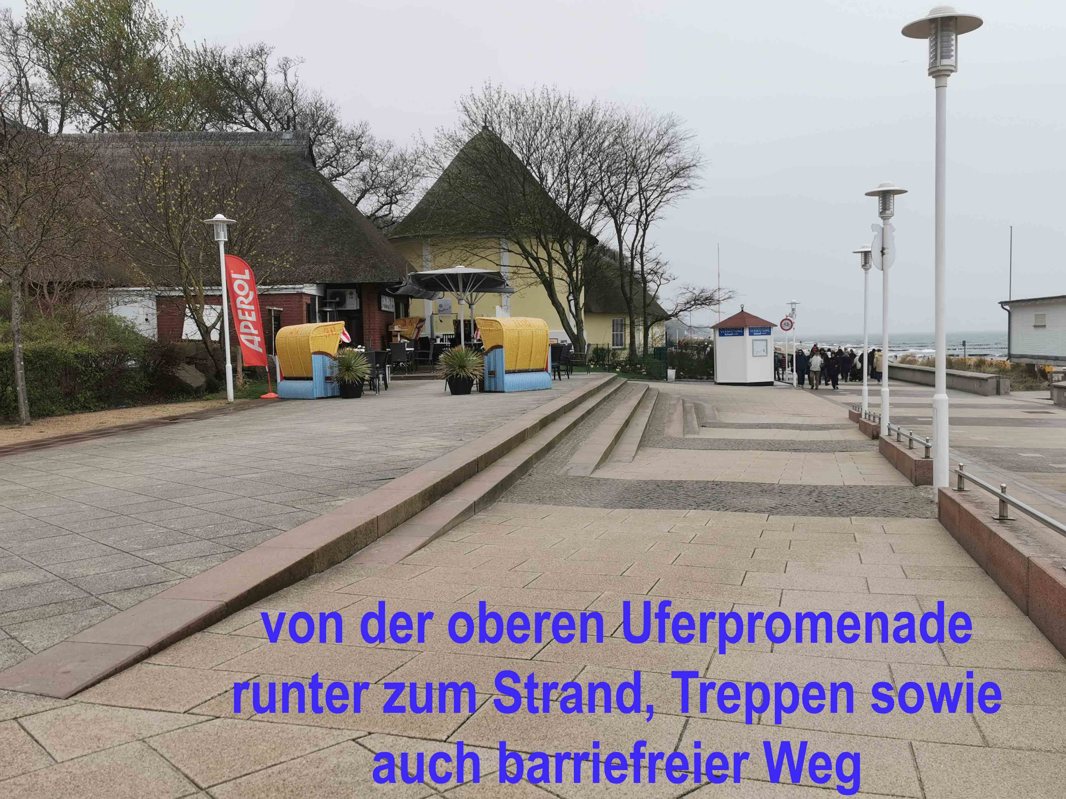 Der Weg zum Strandabschnitt 8 war mustergültig gestaltet: Ein befestigter, rollstuhlgerechter Pfad führte durch ein kurzes Waldstück, seitlich begrenzt von Kopfsteinpflaster, aber in der Mitte perfekt befahrbar. An der Promenade angekommen, führten neben Treppen auch flache Rampen zum Strand hinab – eine durchdachte Lösung für Rollstuhlfahrer und Menschen mit Gehhilfen.