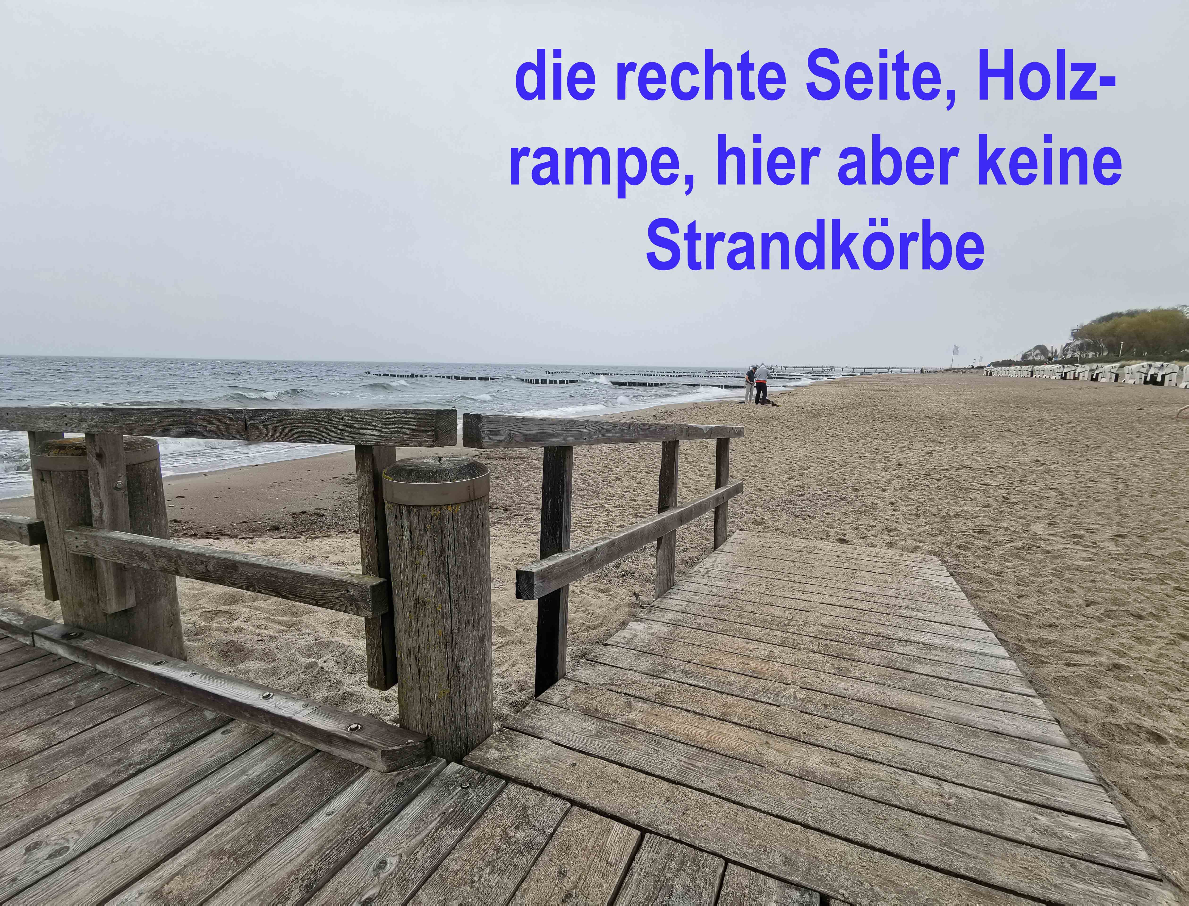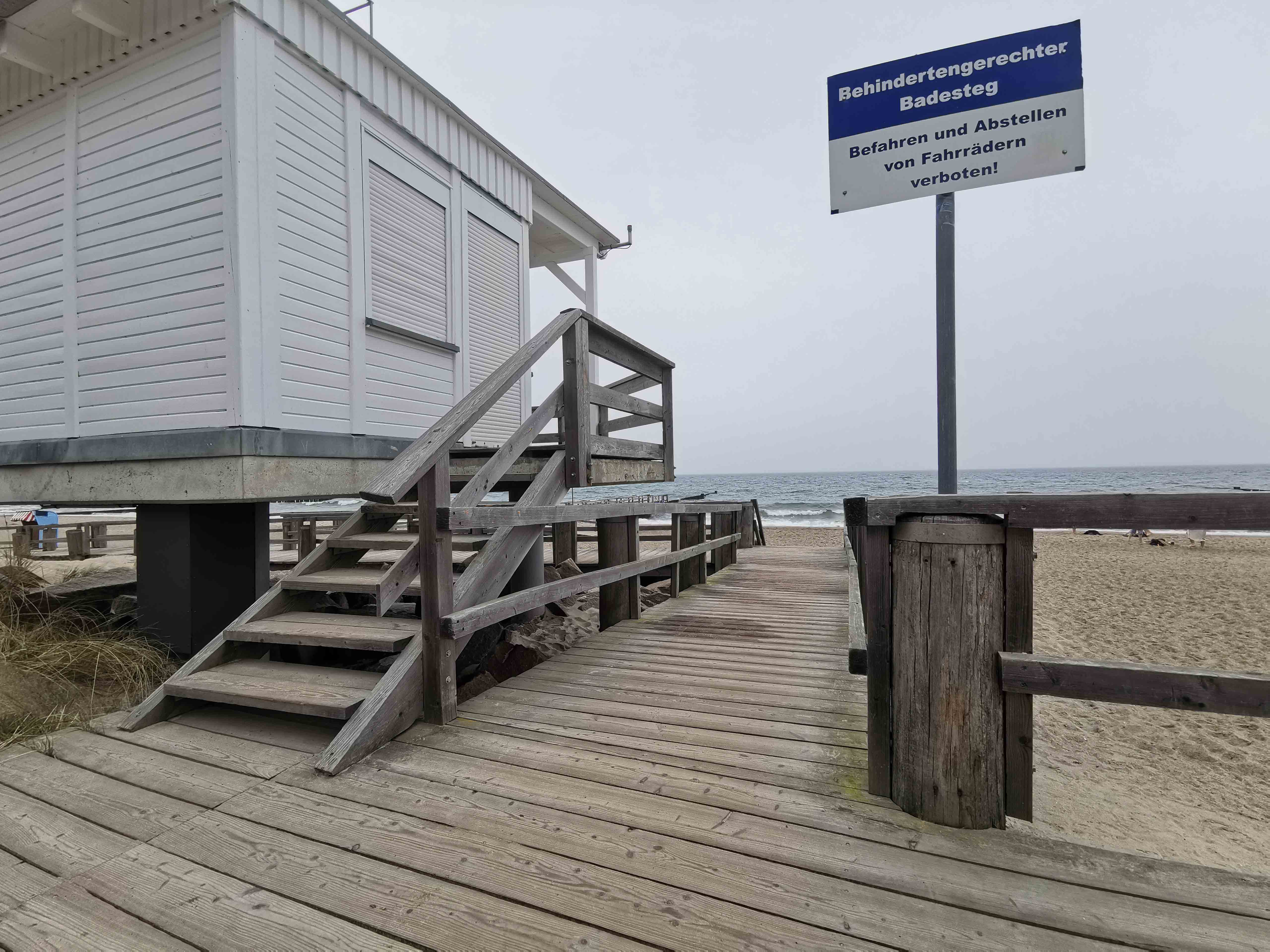 Das absolute Highlight: Der barrierefreie Holzsteg am Strandabschnitt 8! Er führt direkt bis zum Sand, wo spezielle Holzplattformen neben den Strandkörben Rollstuhlfahrern den Zugang ermöglichen. Die DLRG-Wachen an den Strandzugängen 8 und 18 bieten zudem behindertengerechte Badestege mit Treppen ins Wasser.