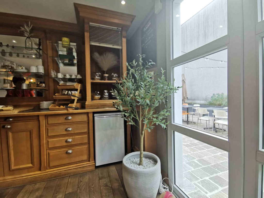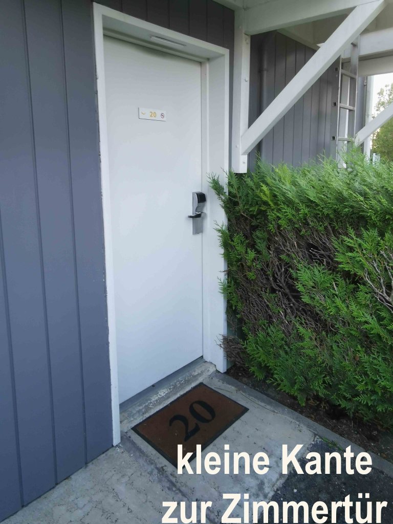 Unser Zimmer lag dagegen im seitlichen Nebengebäude. Hier begann das eigentliche Abenteuer: ein Bürgersteig, den mein kleiner Efix-Rollstuhl nicht alleine schaffen konnte, musste mit Begleitung überwunden werden. Dazu kam ein schräger, sehr schmaler Weg und eine 5 cm hohe Kante vor der Zimmertür – barrierearm, aber für Rollstuhlfahrer ohne Hilfe kaum machbar.
