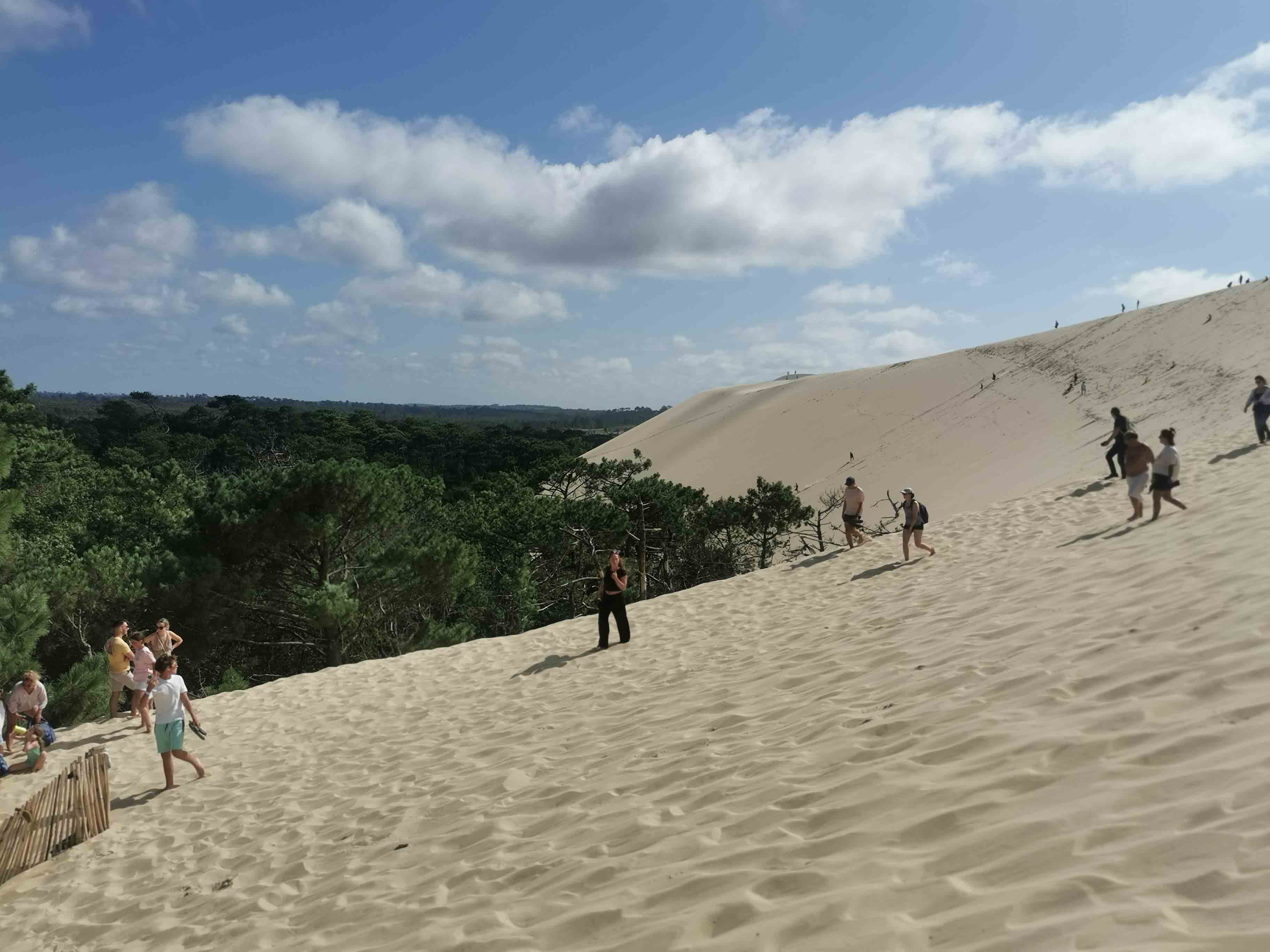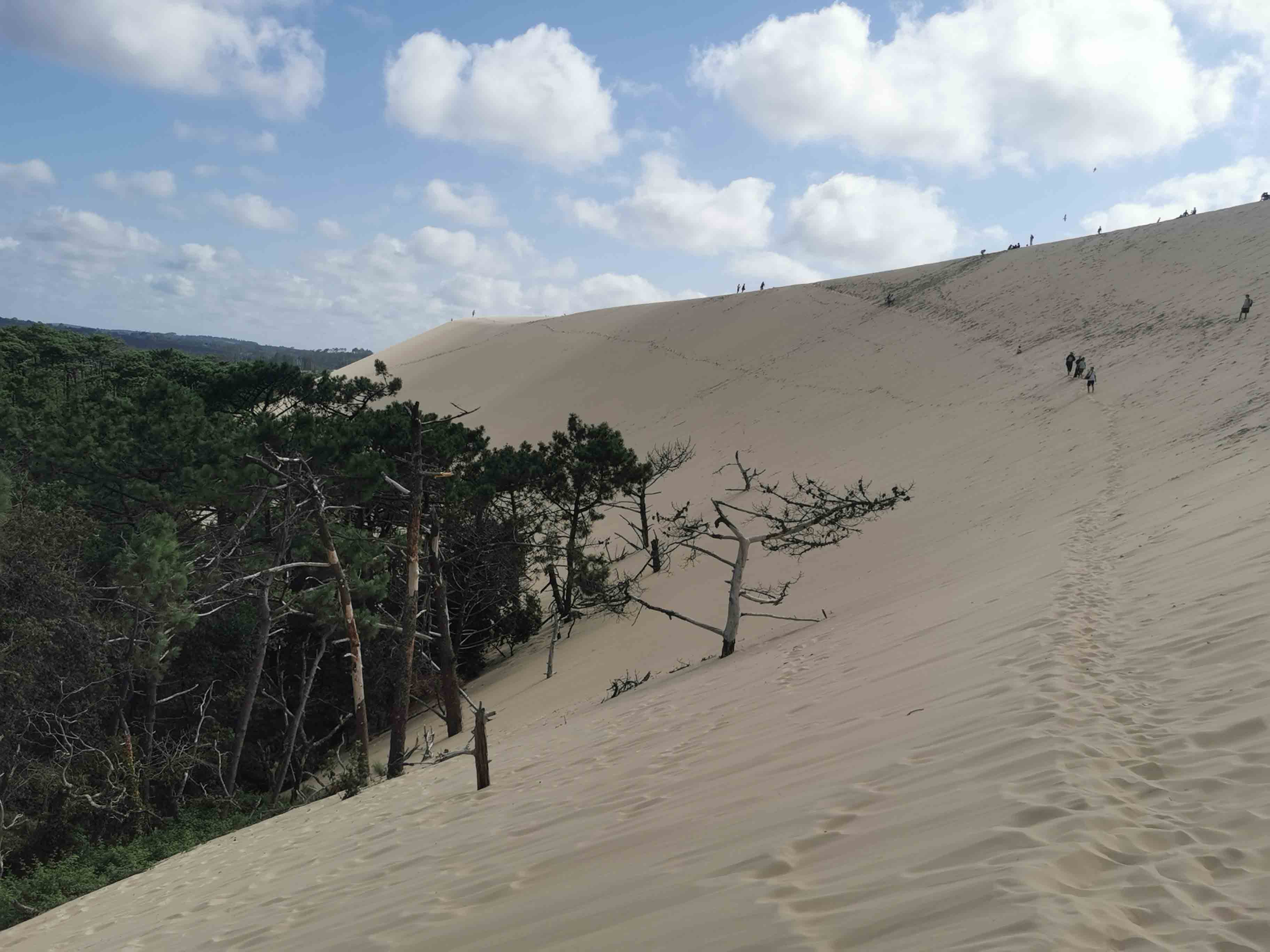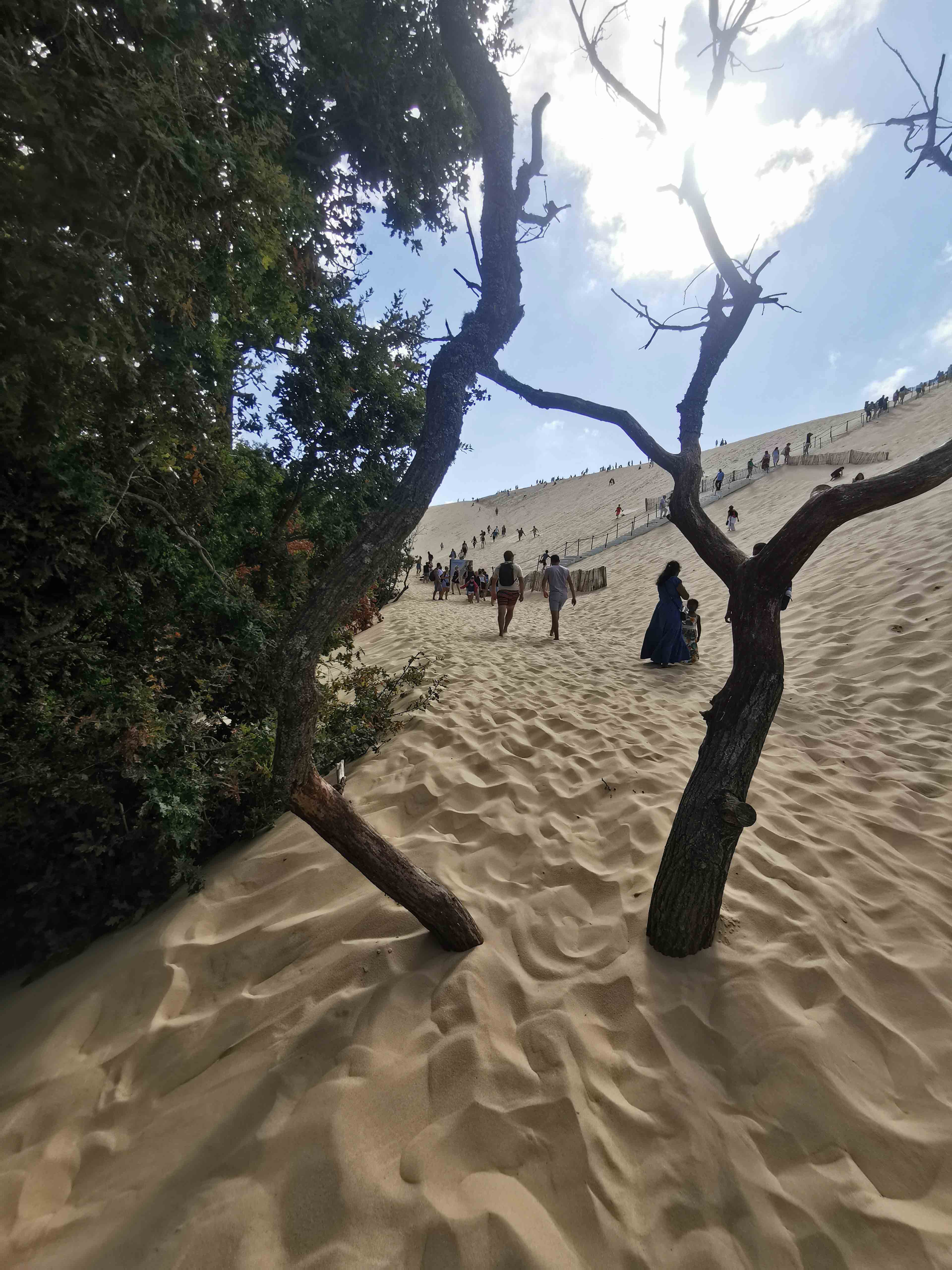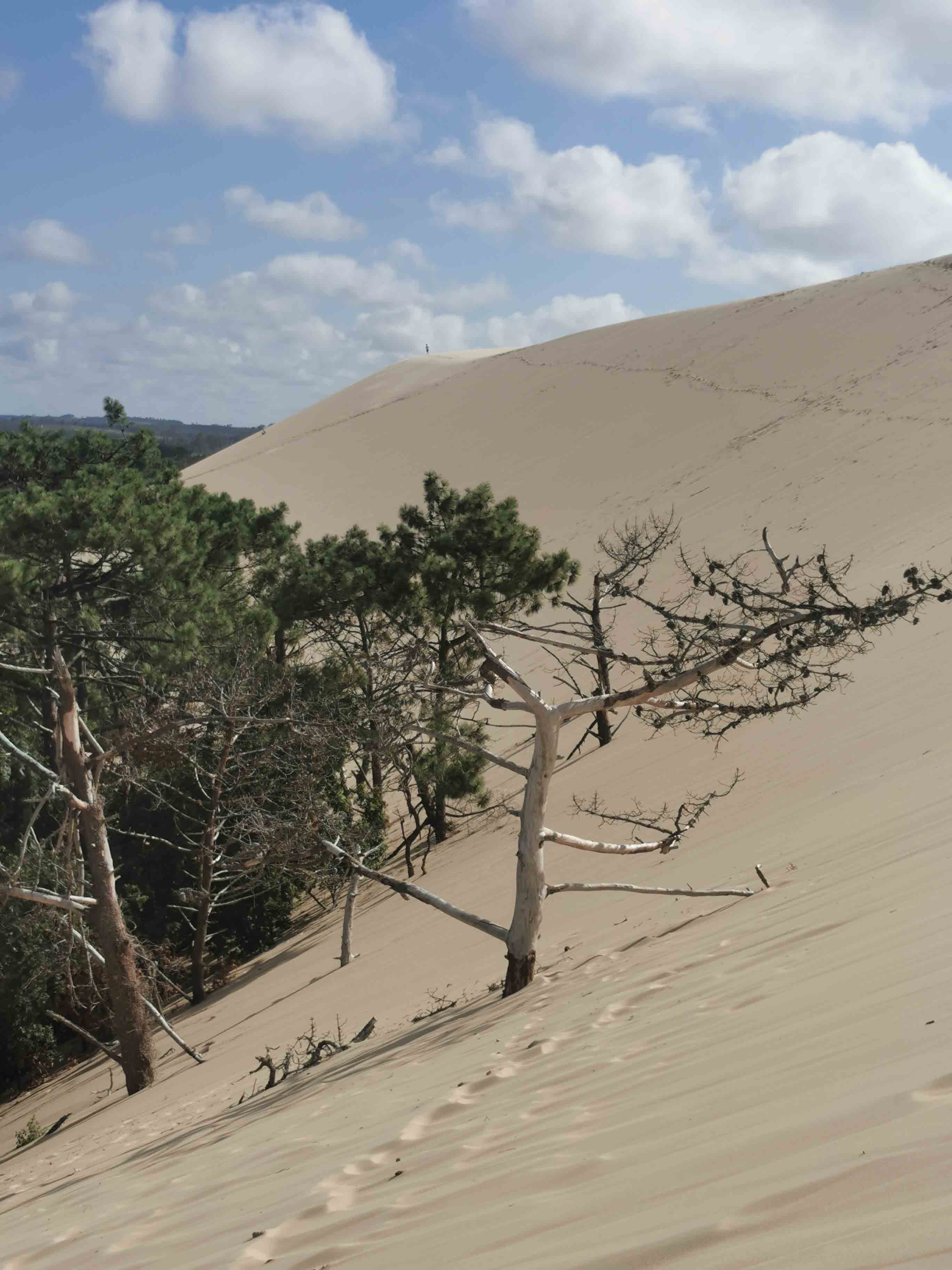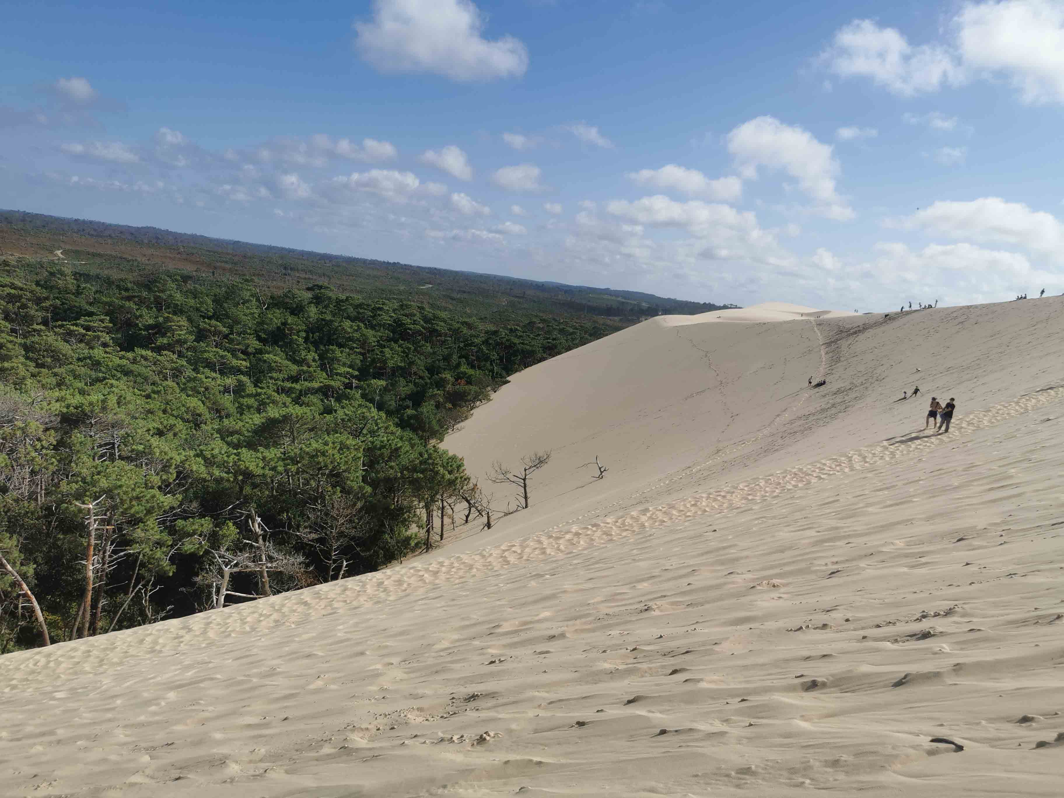 Von Mimizan aus führte uns unsere Reise weiter nach Arcachon. Während am Atlantik noch blauer Himmel und Sonne herrschten, zogen im Landesinneren immer mehr Wolken auf. Die Landschaft veränderte sich – und plötzlich, wie eine Fata Morgana, tauchte zwischen den Kiefern etwas auf, das eher an eine Wüste oder an Pyramiden erinnerte: gewaltige Sandberge, die sich über den Wald erhoben.