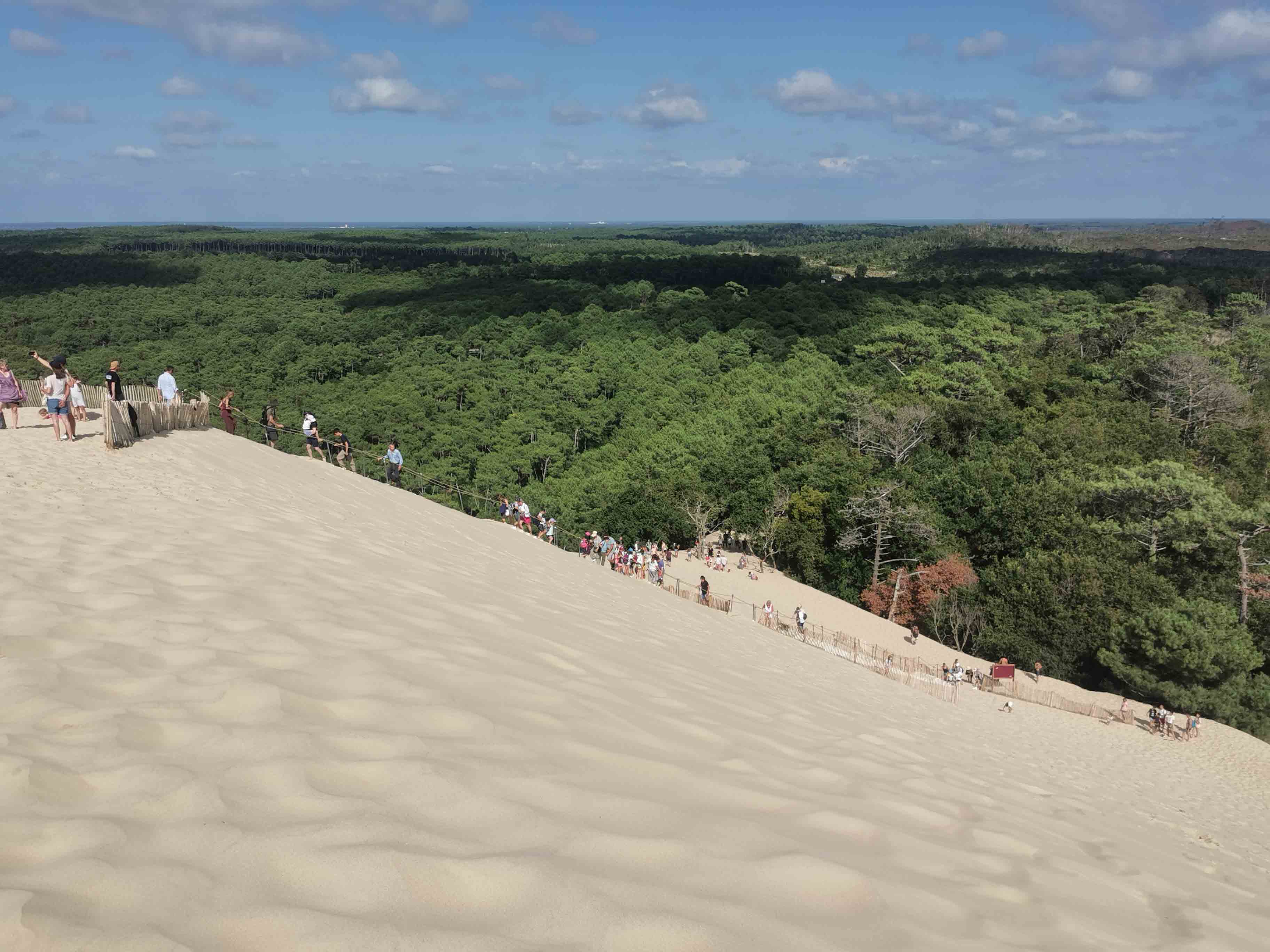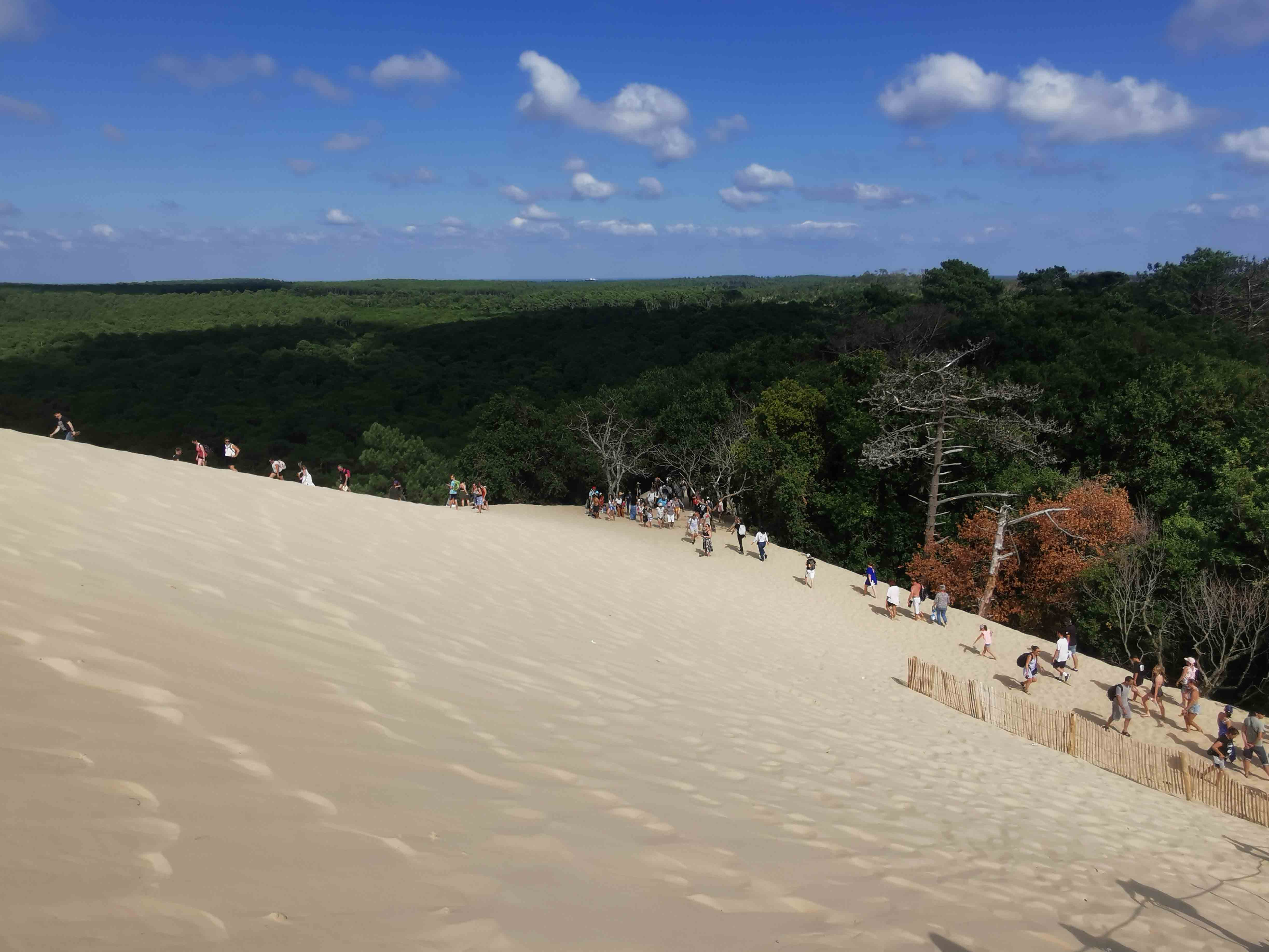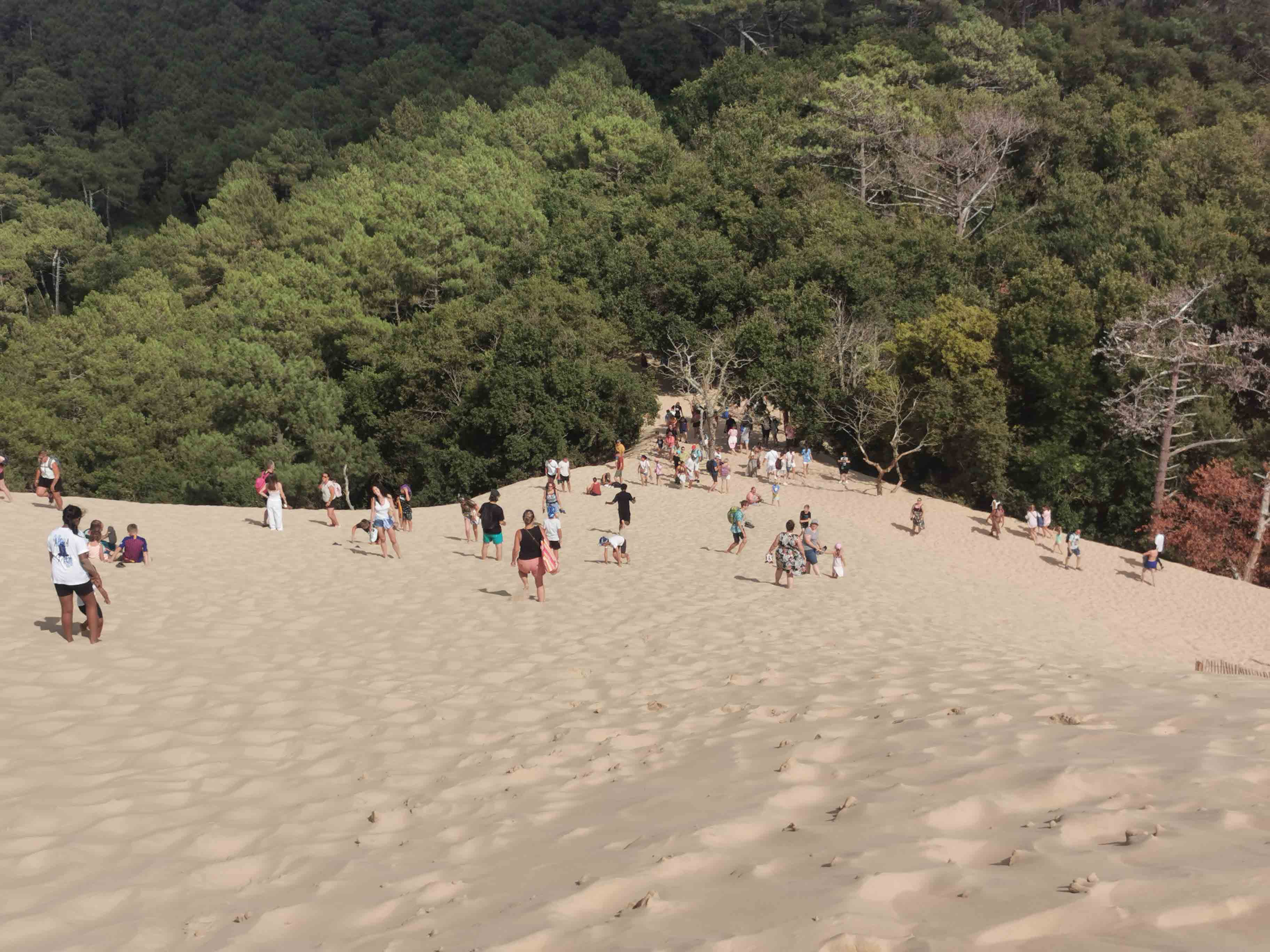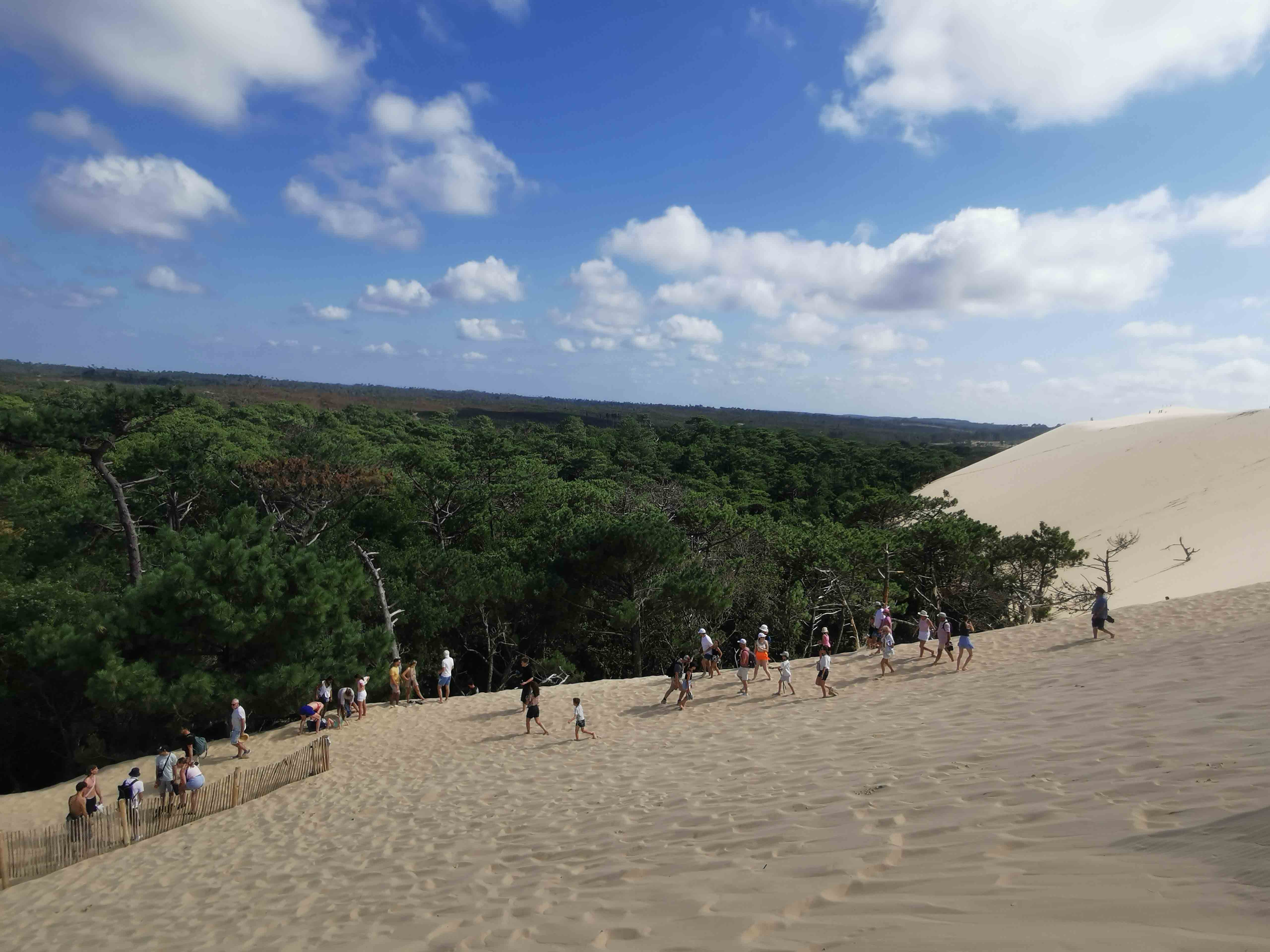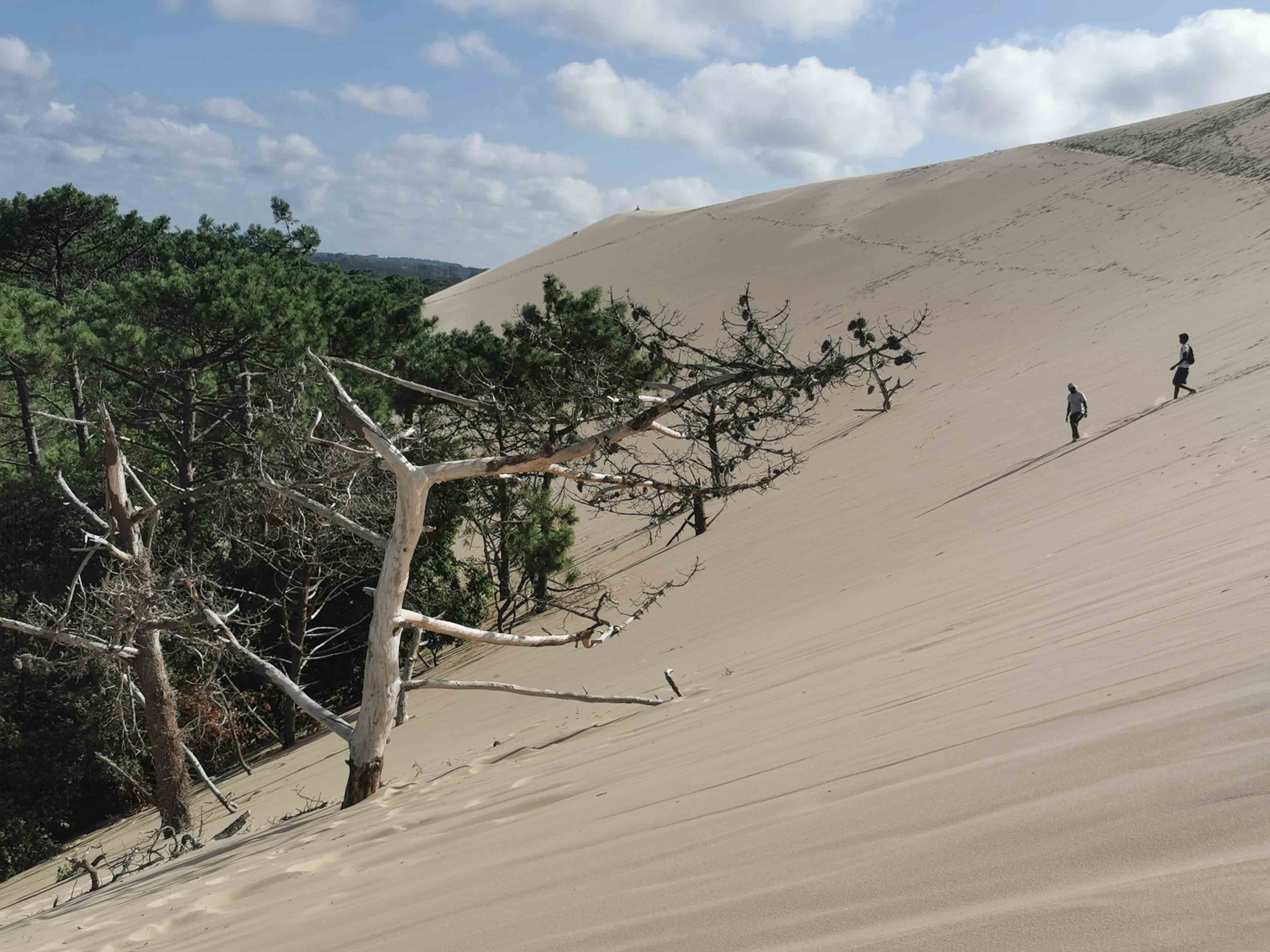 Von Mimizan aus führte uns unsere Reise weiter nach Arcachon. Während am Atlantik noch blauer Himmel und Sonne herrschten, zogen im Landesinneren immer mehr Wolken auf. Die Landschaft veränderte sich – und plötzlich, wie eine Fata Morgana, tauchte zwischen den Kiefern etwas auf, das eher an eine Wüste oder an Pyramiden erinnerte: gewaltige Sandberge, die sich über den Wald erhoben.