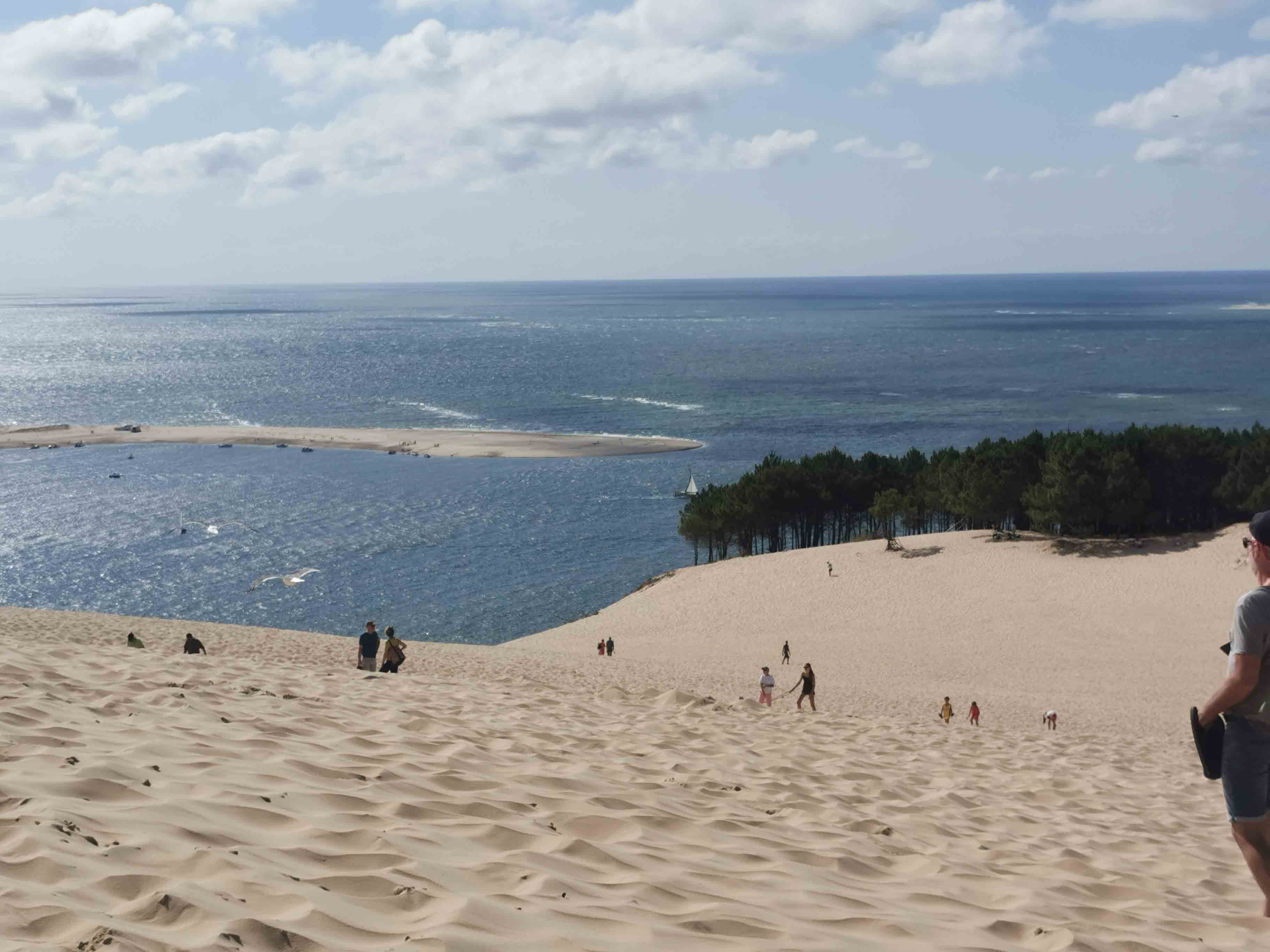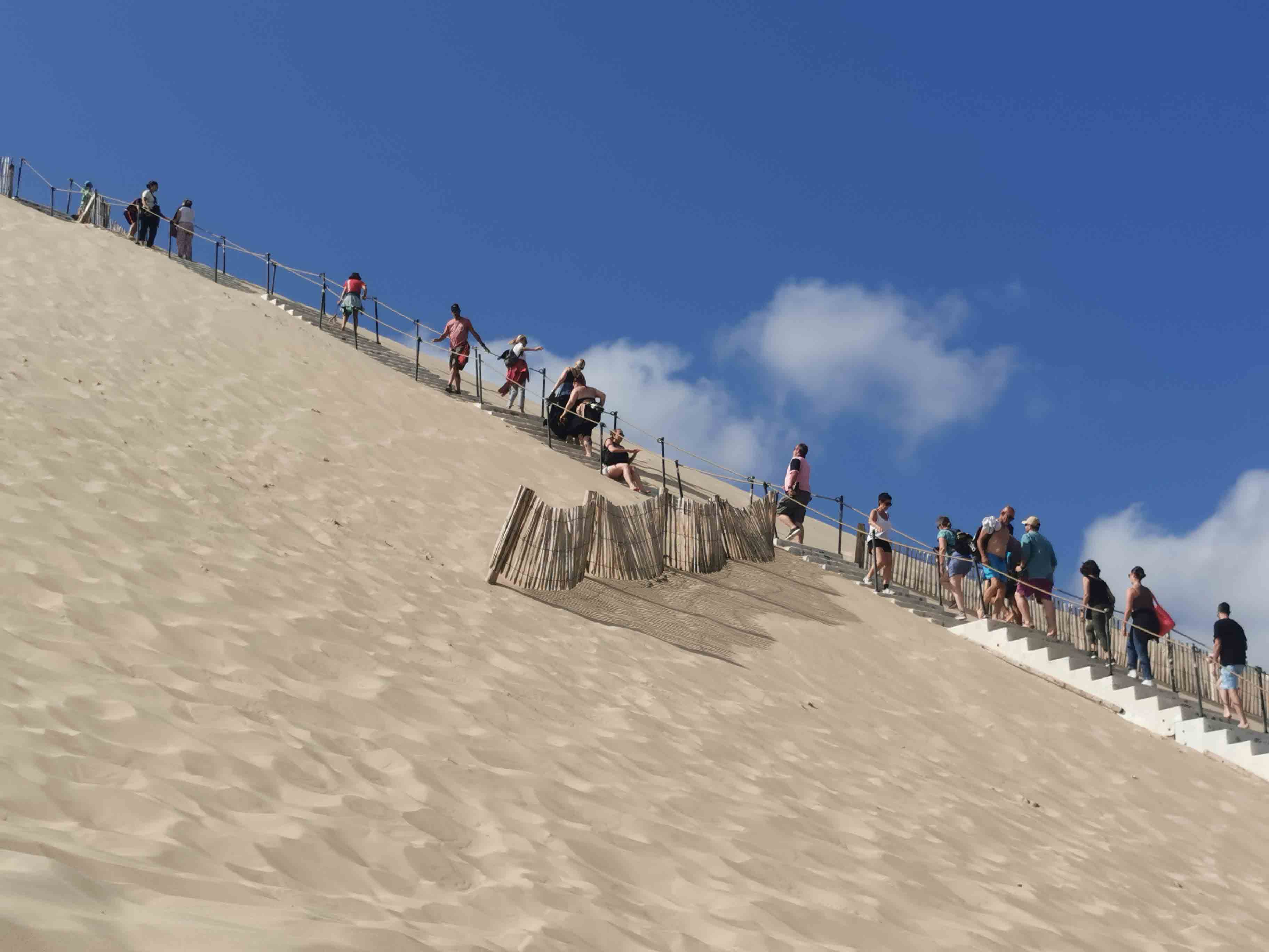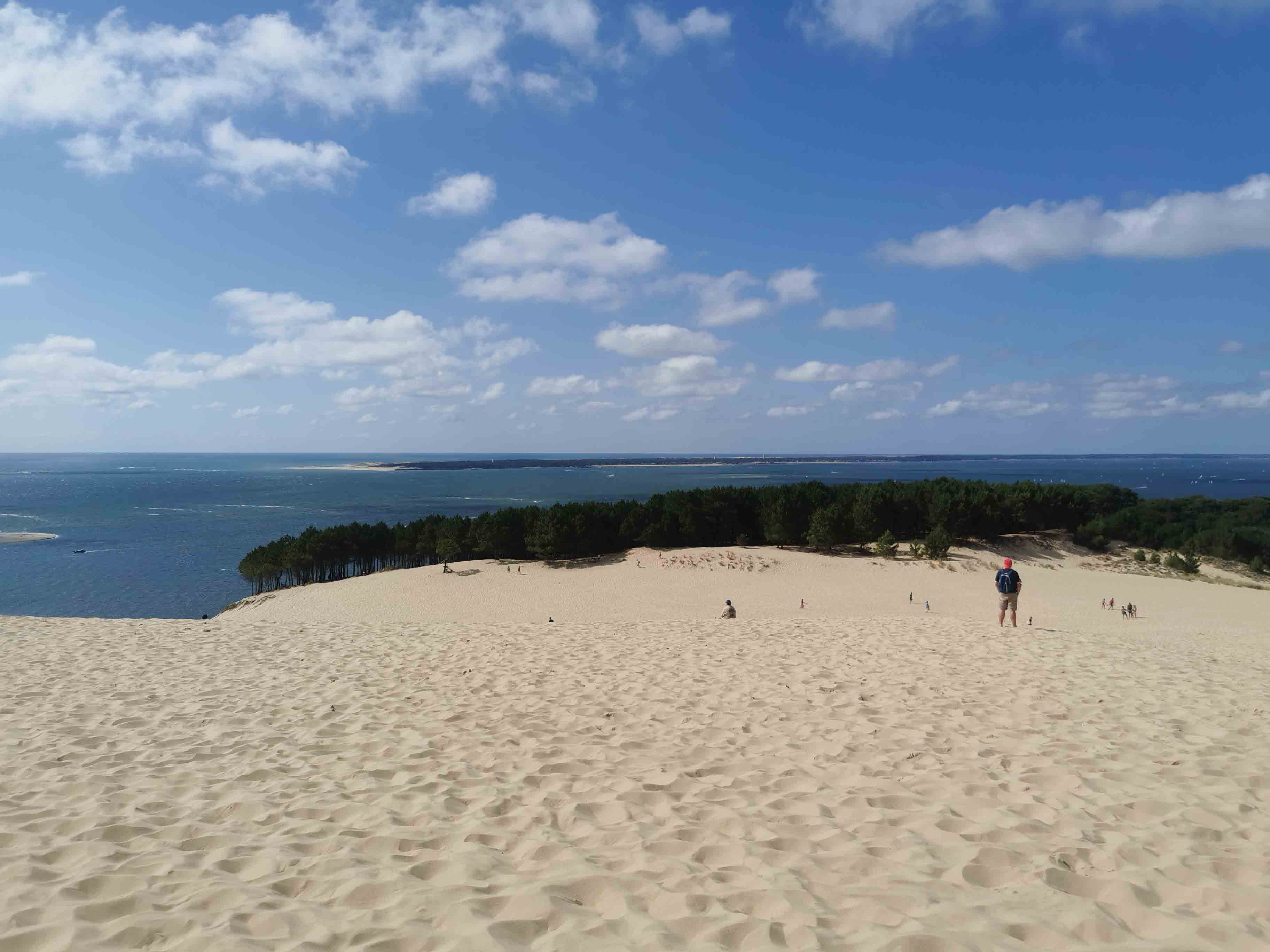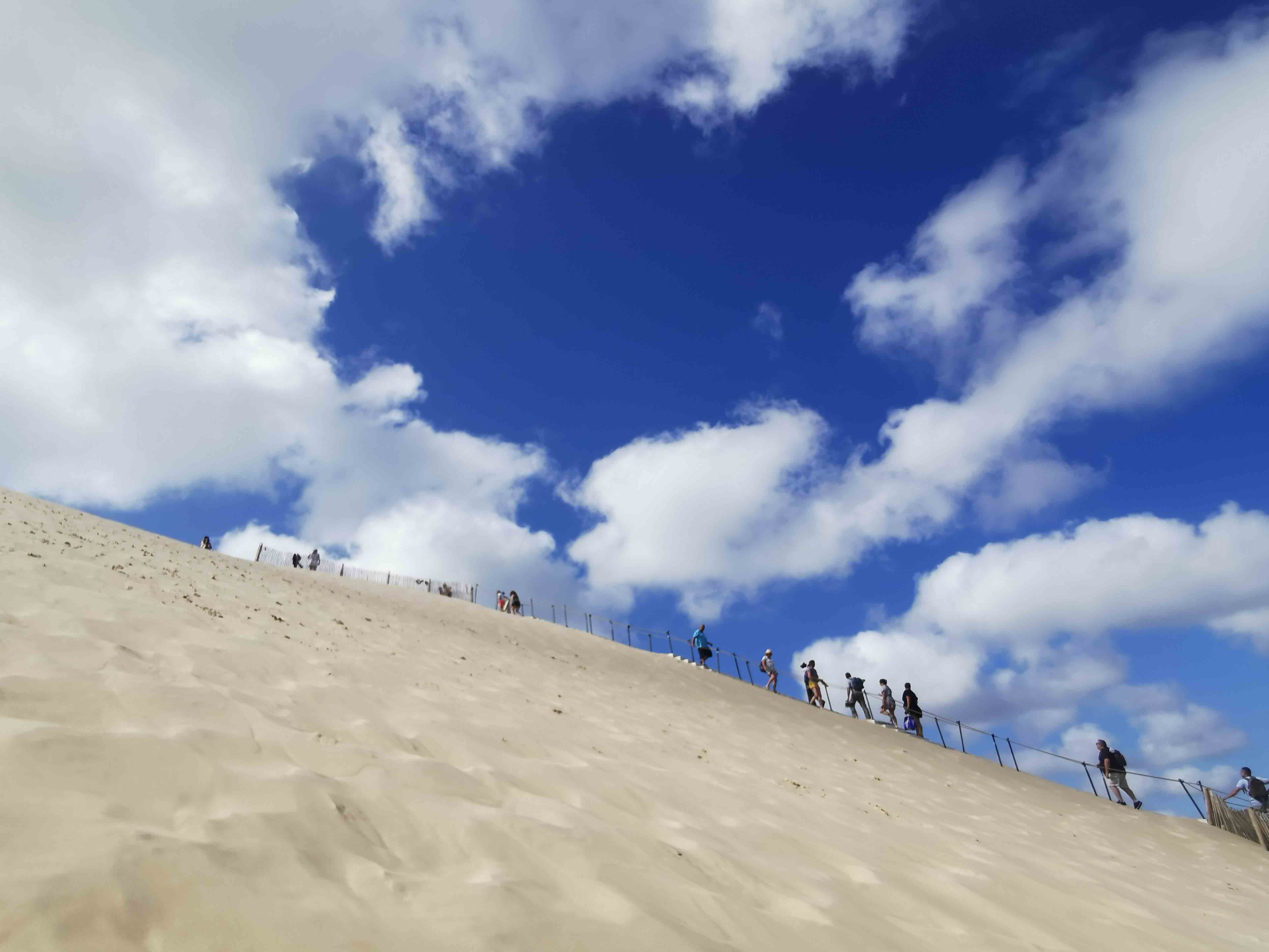 Tatsächlich befand ich mich nicht in Nordafrika, sondern in Frankreich, vor der Dune du Pilat, der größten Wanderdüne Europas. Sie liegt südlich von Arcachon in der Region Nouvelle-Aquitaine, ist rund drei Kilometer lang, bis zu 500 Meter breit und etwa 100 bis 115 Meter hoch. Ständig wird sie vom Wind geformt und wandert Jahr für Jahr ein Stück weiter ins Landesinnere – ein Naturwunder am Atlantik.