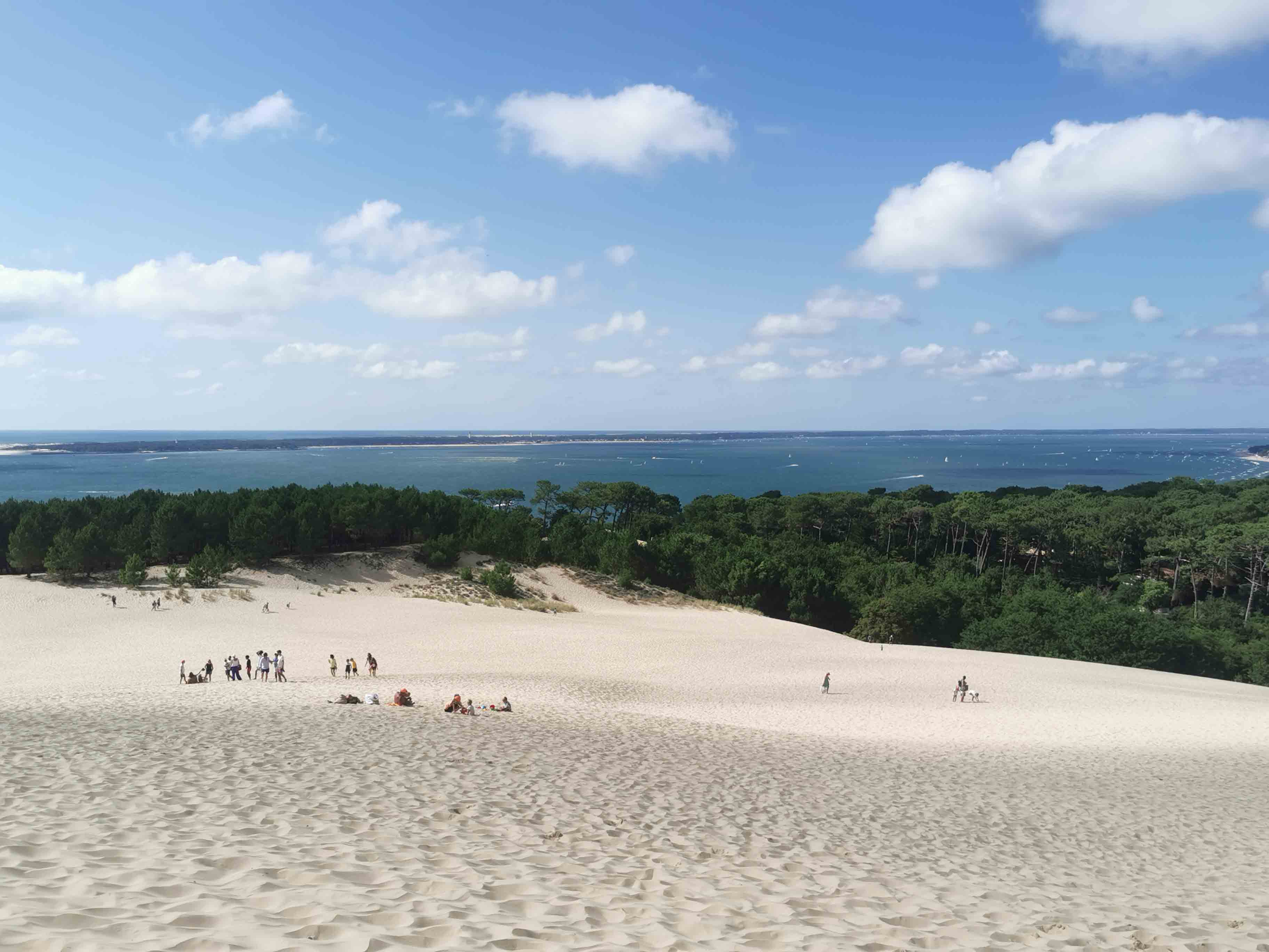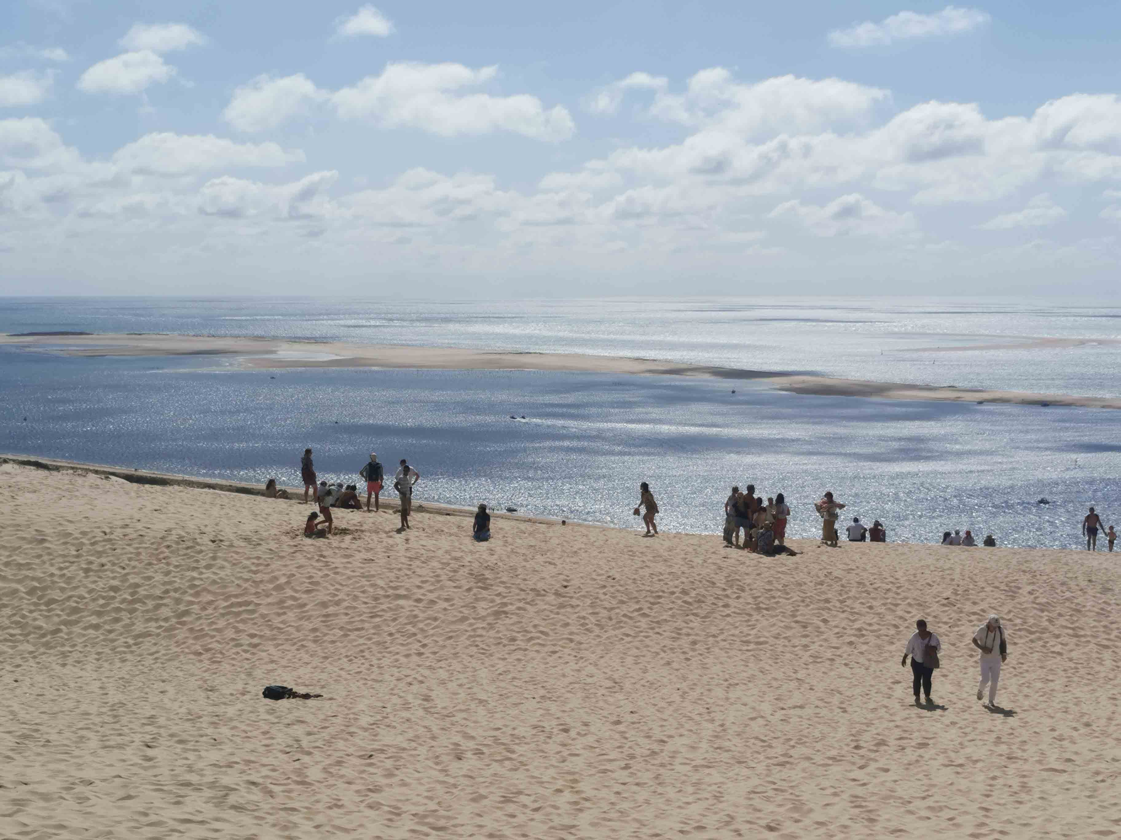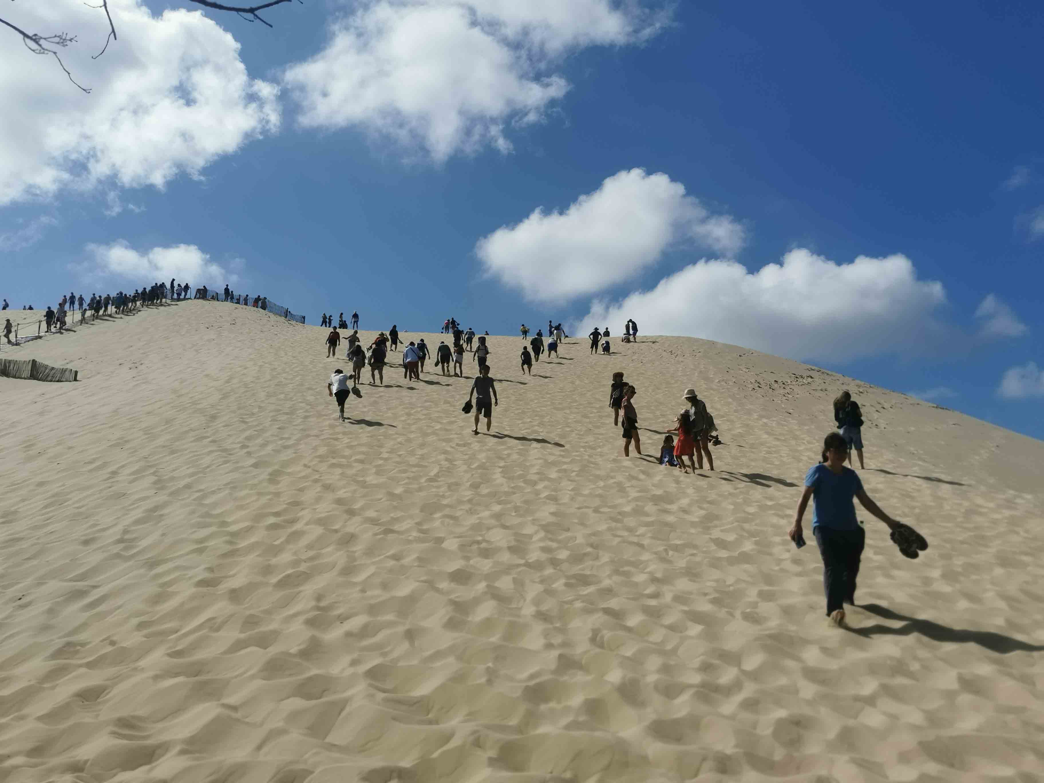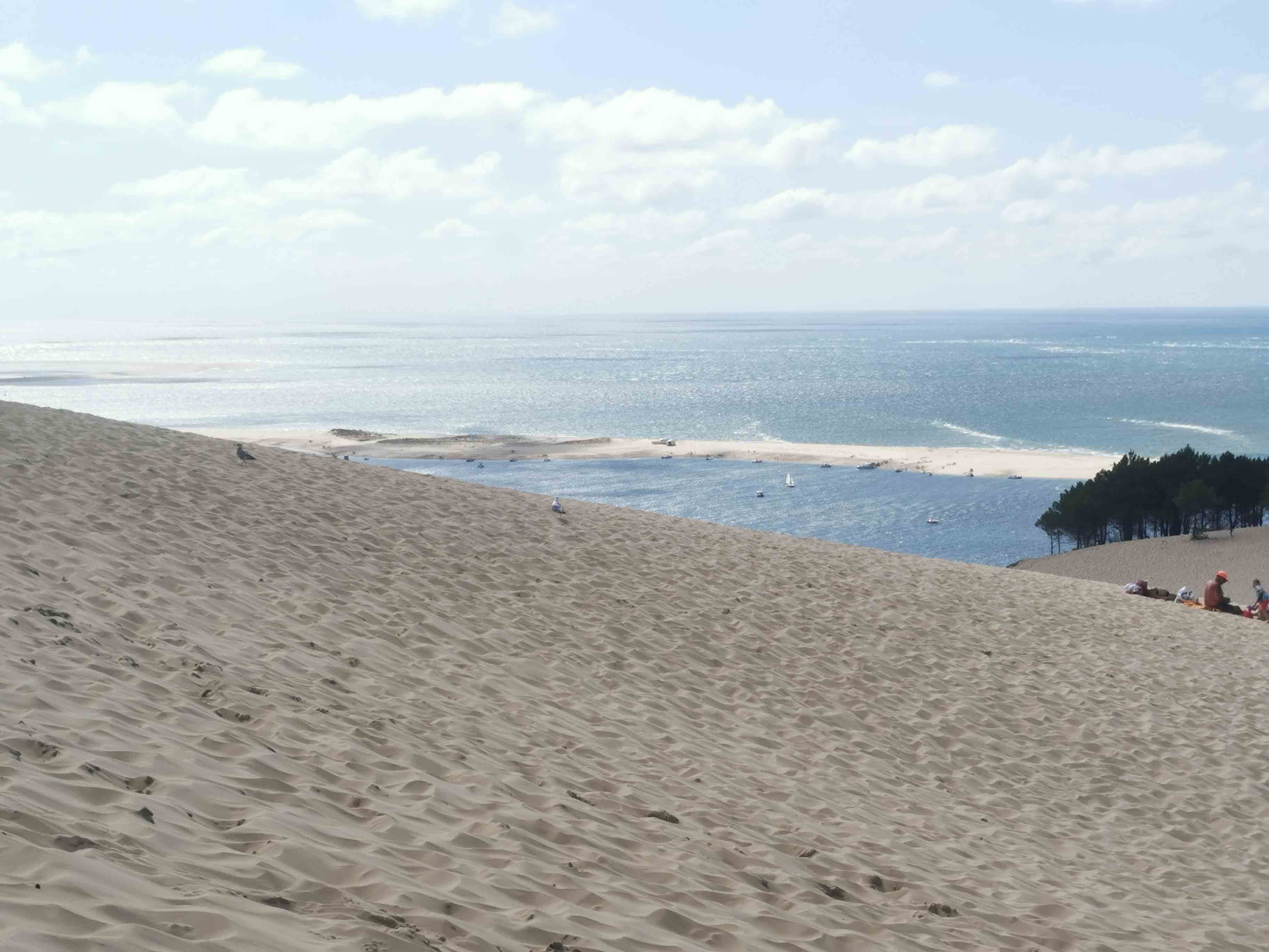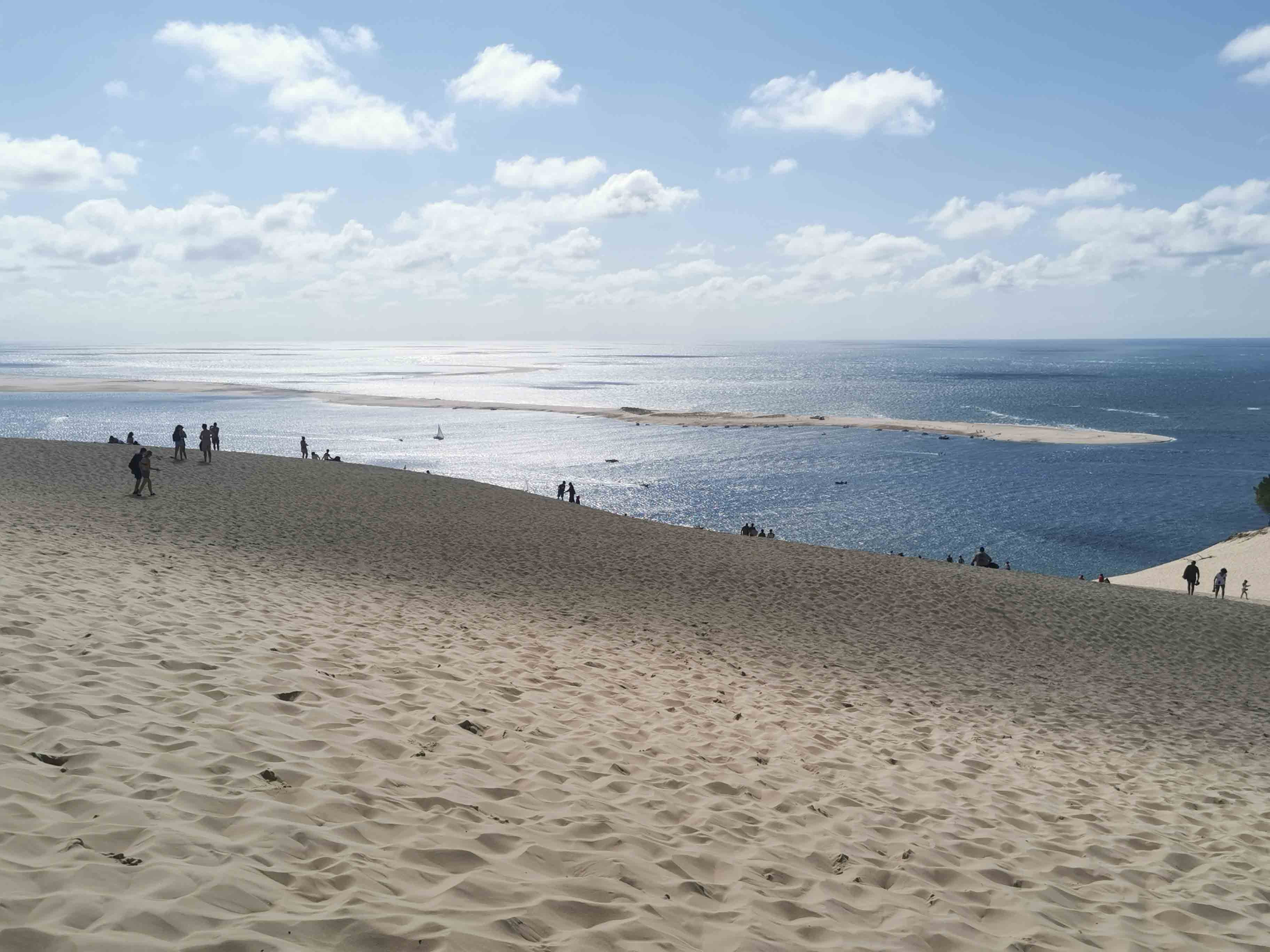 Tatsächlich befand ich mich nicht in Nordafrika, sondern in Frankreich, vor der Dune du Pilat, der größten Wanderdüne Europas. Sie liegt südlich von Arcachon in der Region Nouvelle-Aquitaine, ist rund drei Kilometer lang, bis zu 500 Meter breit und etwa 100 bis 115 Meter hoch. Ständig wird sie vom Wind geformt und wandert Jahr für Jahr ein Stück weiter ins Landesinnere – ein Naturwunder am Atlantik.