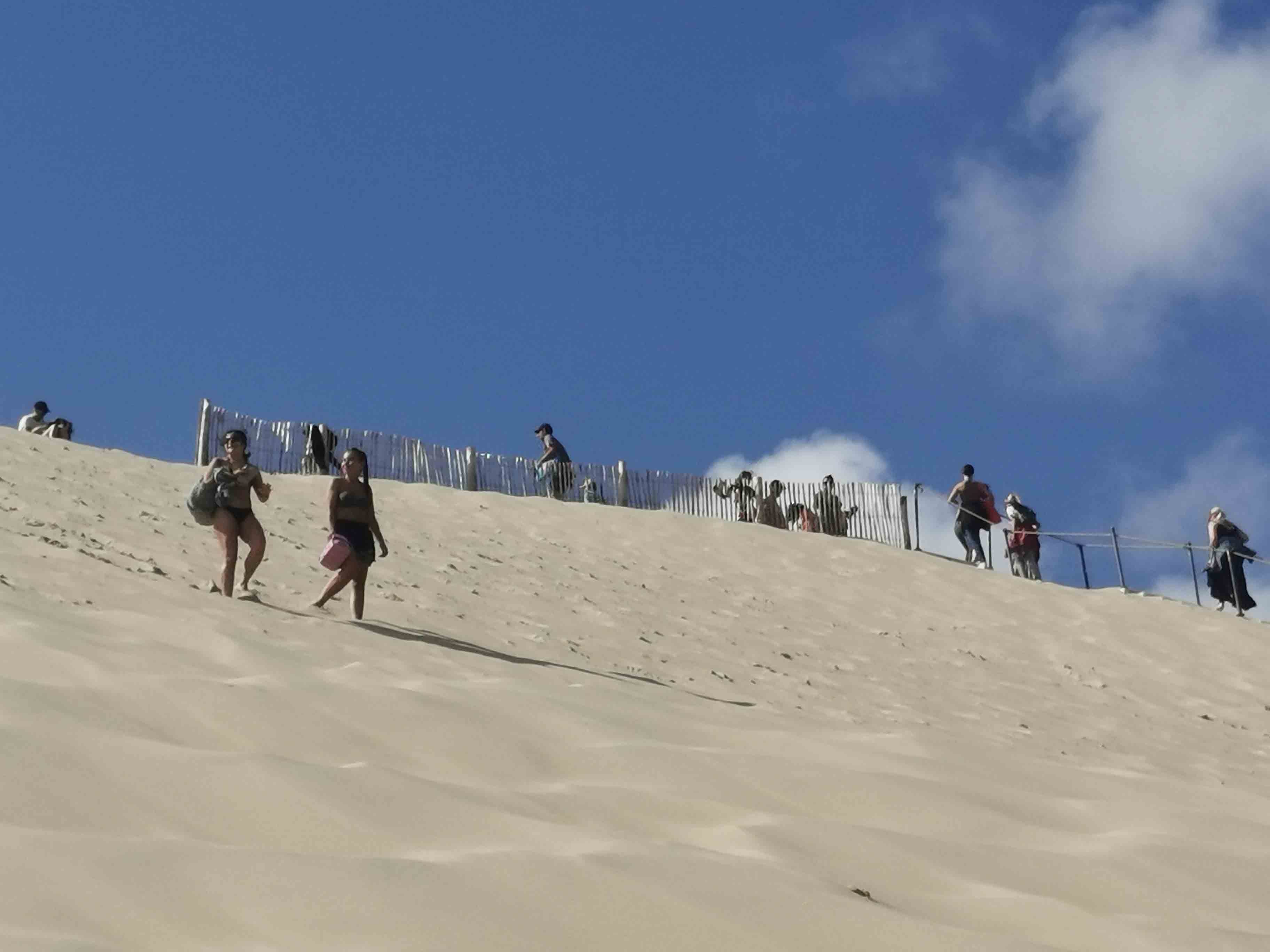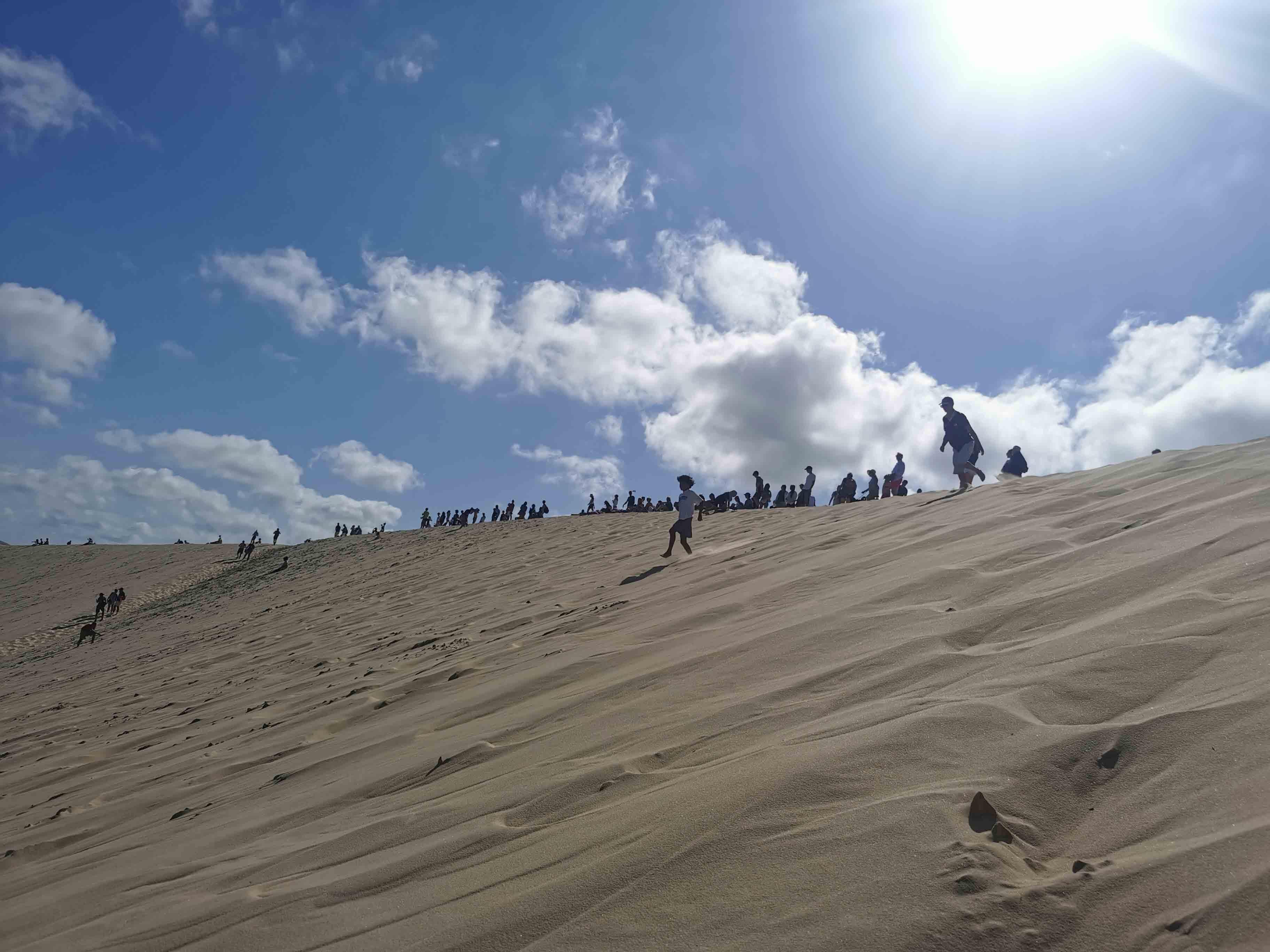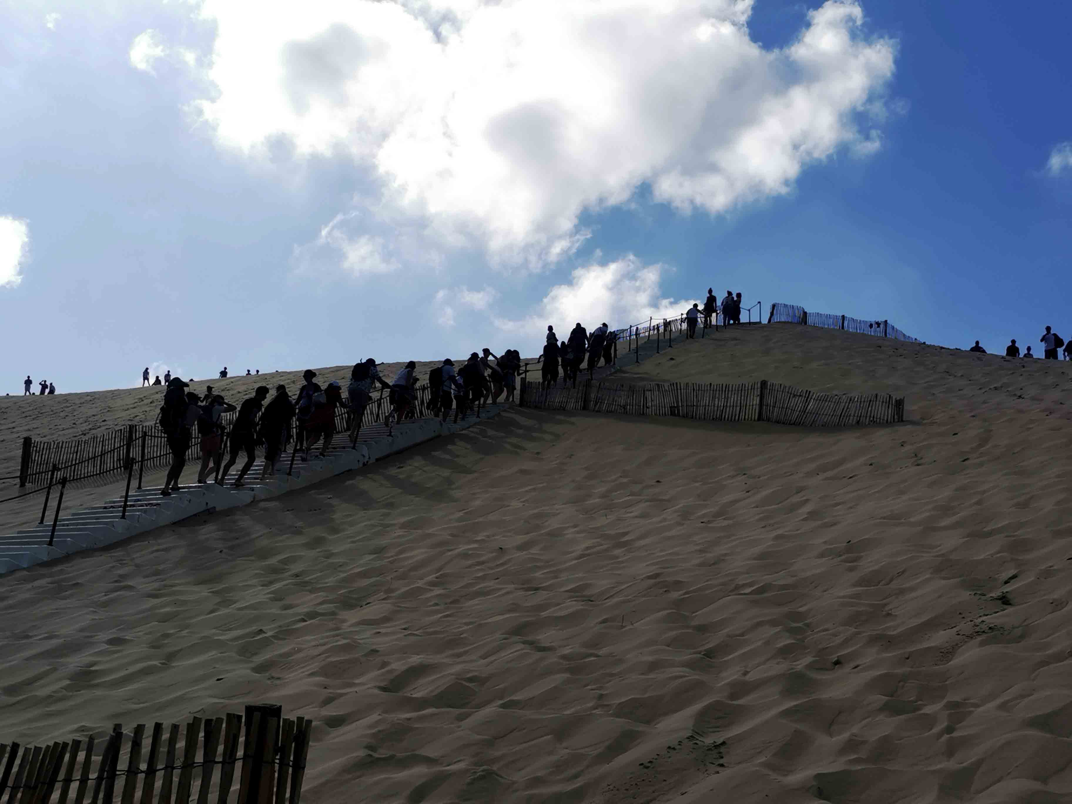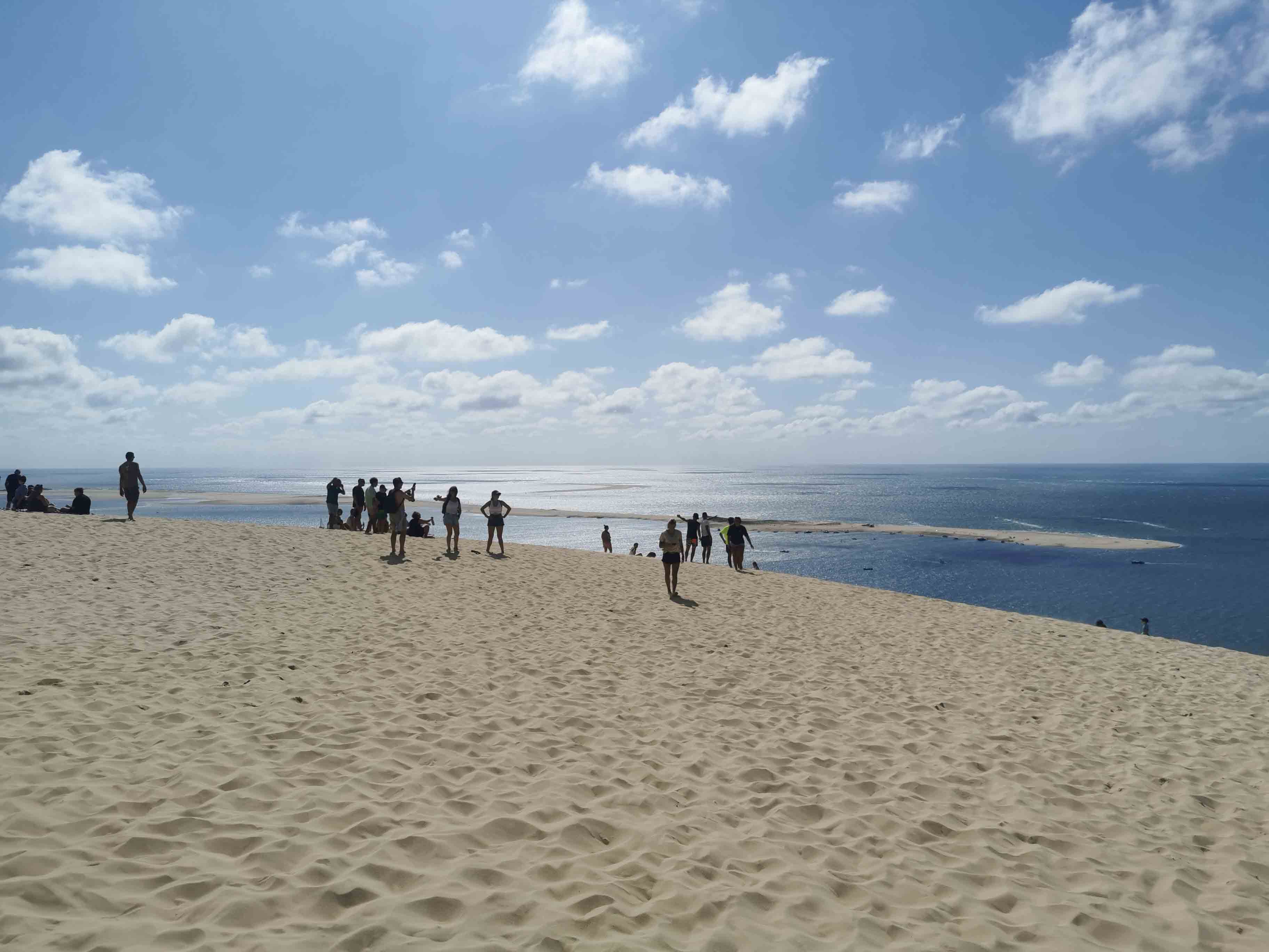 Tatsächlich befand ich mich nicht in Nordafrika, sondern in Frankreich, vor der Dune du Pilat, der größten Wanderdüne Europas. Sie liegt südlich von Arcachon in der Region Nouvelle-Aquitaine, ist rund drei Kilometer lang, bis zu 500 Meter breit und etwa 100 bis 115 Meter hoch. Ständig wird sie vom Wind geformt und wandert Jahr für Jahr ein Stück weiter ins Landesinnere – ein Naturwunder am Atlantik.