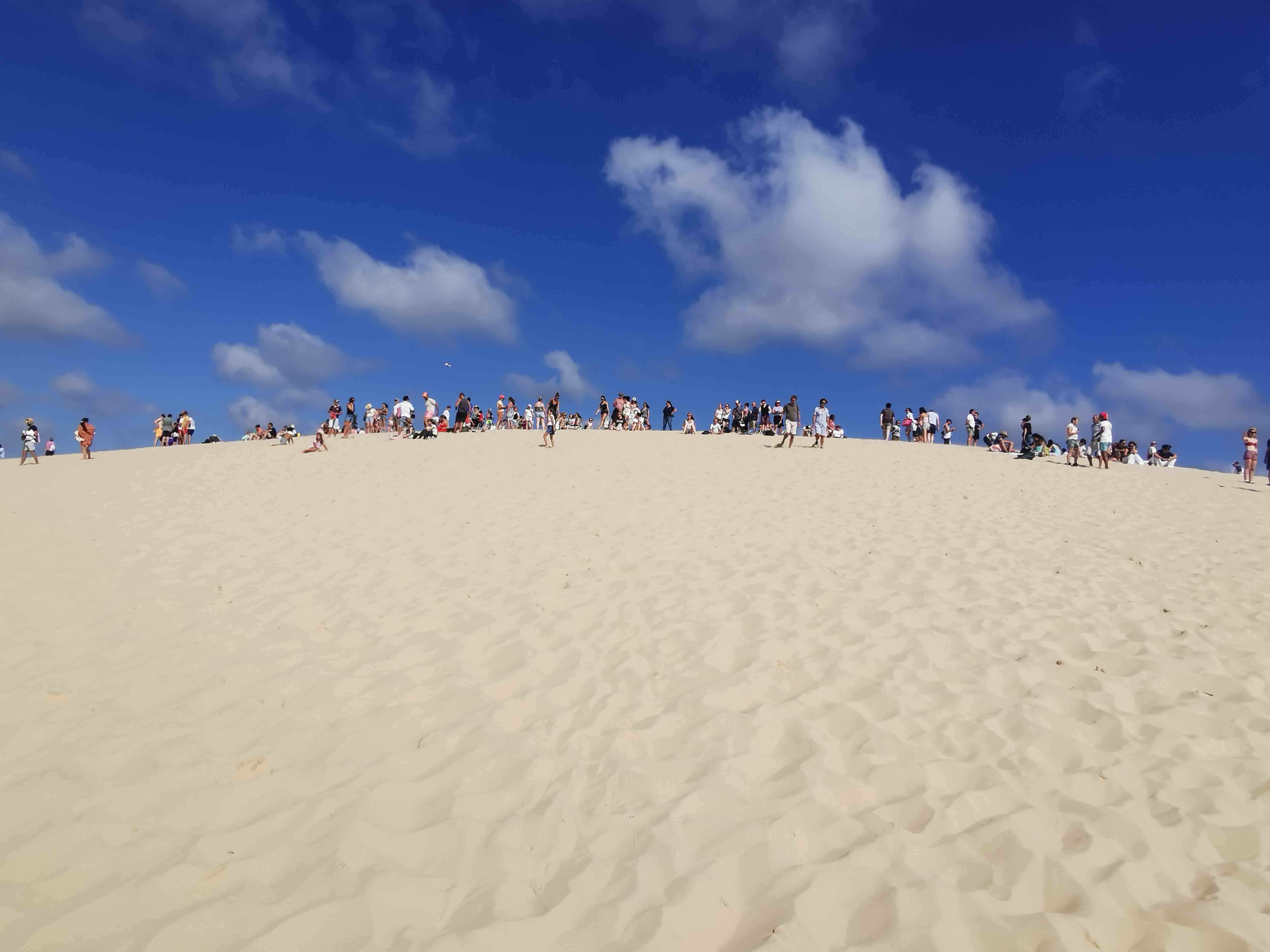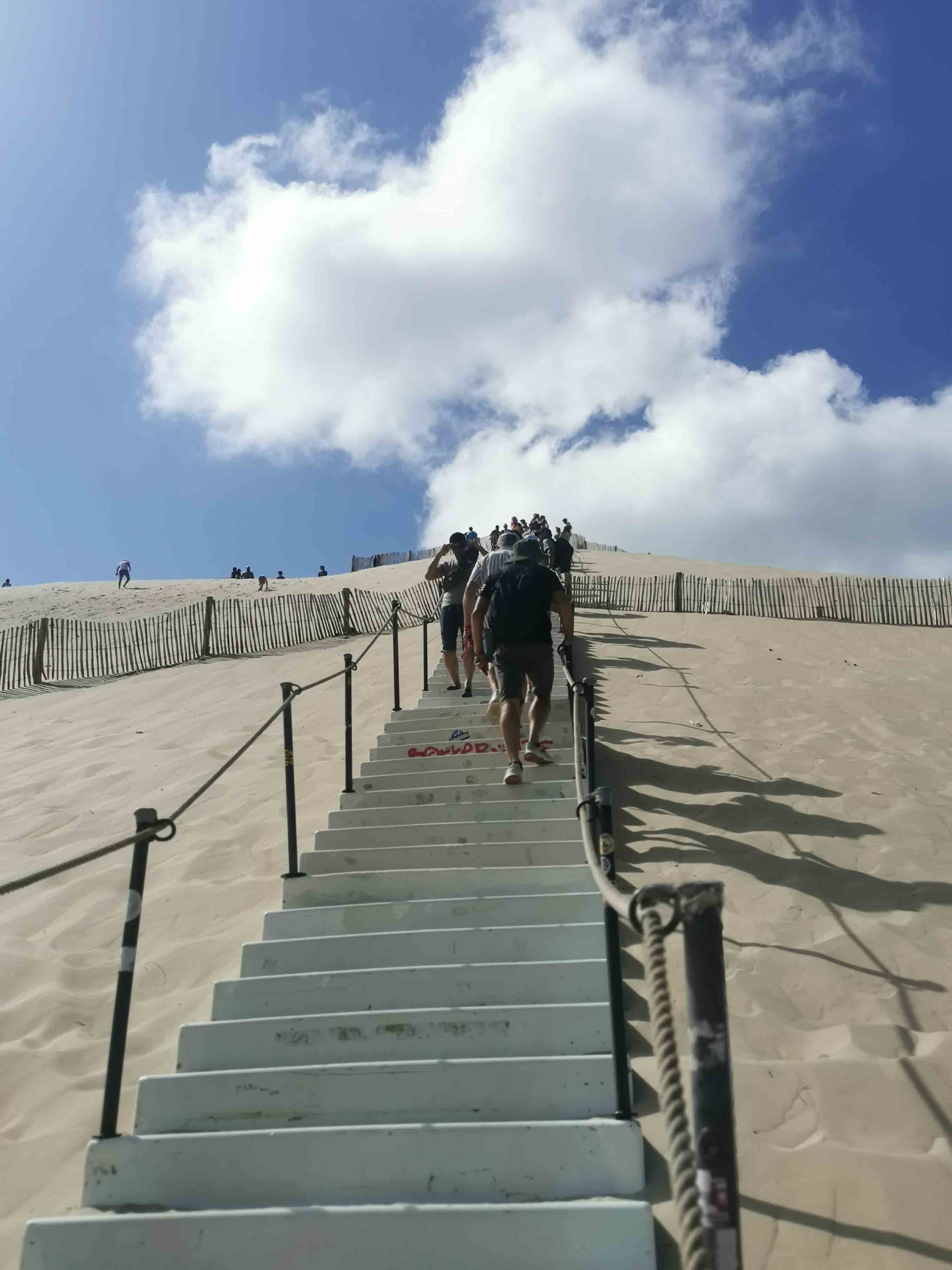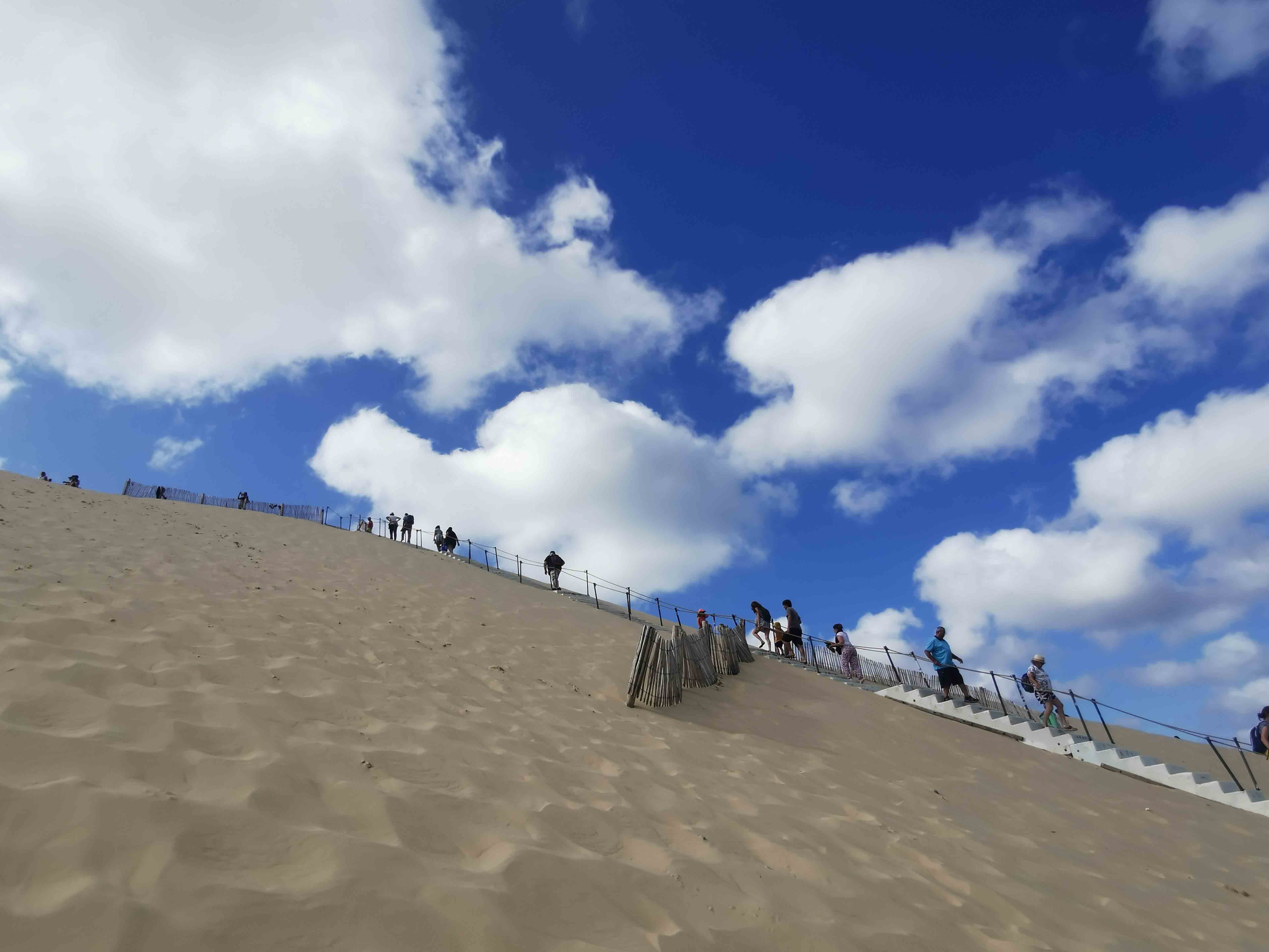 Ich blieb neben einer Sitzbank zurück und bat meine Begleitung, die Düne für mich zu besteigen und Fotos zu machen. Von unten sah ich, dass es zwei Möglichkeiten gibt: Entweder direkt durch den Sand hochsteigen oder über eine Holztreppe, die in der Saison aufgebaut ist. Mein Begleiter war tief beeindruckt – von der Weite, dem Blick aufs Meer und der schieren Größe der Düne. Für ihn war es ein faszinierendes Erlebnis.