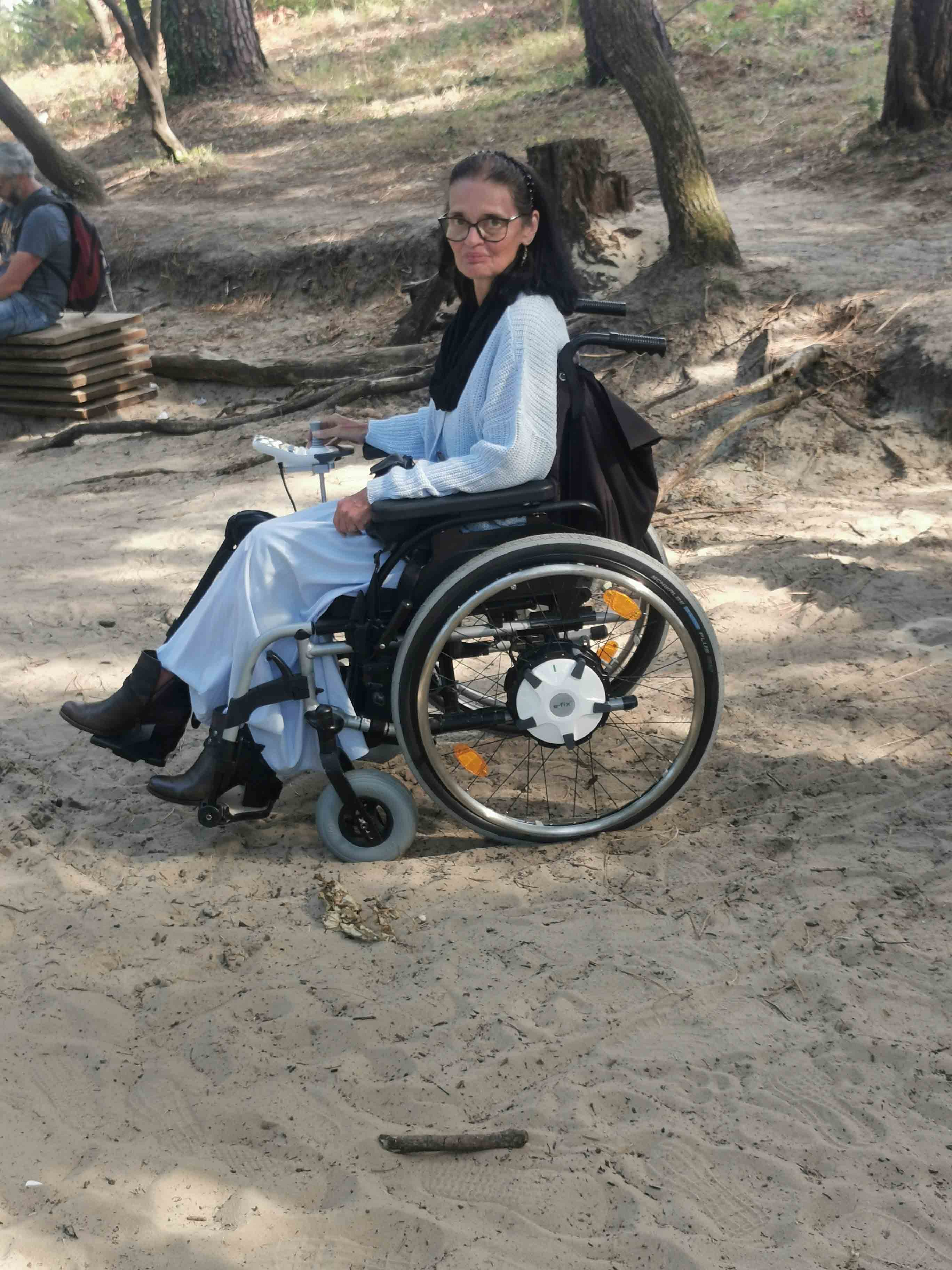 Von dort aus ging es weiter Richtung Düne. Zunächst war der Weg asphaltiert, später führte er über festgetretenen Waldboden, der stellenweise mit Sand bedeckt war. Und dann lag sie vor mir: ein goldener Sandberg, der zwischen Kiefern und Ozean aufragt, vom Wind geformt, seidig im Sonnenlicht glänzend. Ich konnte mit dem Rollstuhl etwa 50 bis 60 Meter weit in den Wald hinein fahren, doch dann wurde der Untergrund zu schwierig, um näher an die Düne heranzukommen.