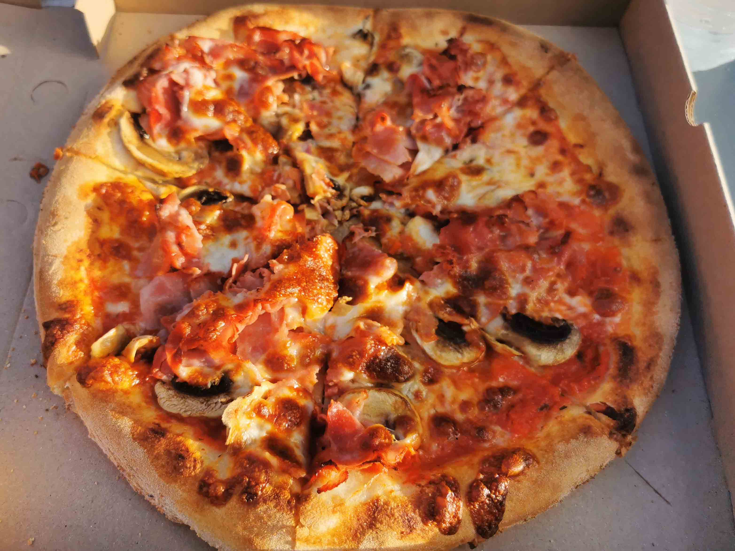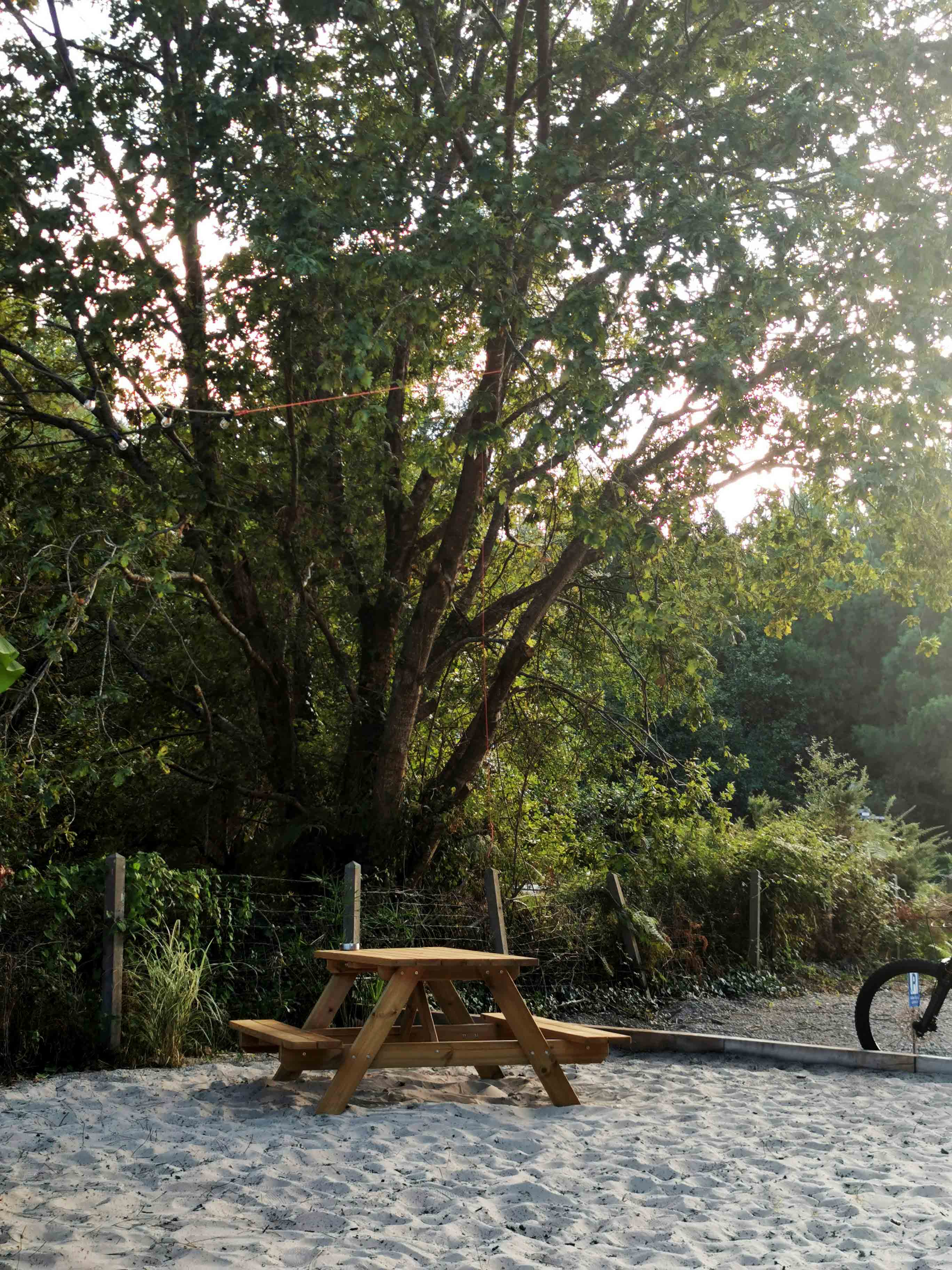 Das Scheunentor diente gleichzeitig als Empfangsbereich und Theke. Dort gaben wir unsere Bestellung auf. Hinter der Theke konnte man in die lebendige, offene Küche blicken: glühende Pizzaöfen, gestapelte Kartons, riesige Mehlsäcke und eifrige Pizzabäcker, die den Teig liebevoll vorbereiteten. Unter der rustikalen Decke hingen dekorative Strohlampen, die dem Ganzen eine warme, charmante und authentische Atmosphäre verliehen. Rechts vorne stand ein großer Kühlschrank, aus dem wir uns unkompliziert frisches Wasser nahmen – selbstbedienungsfreundlich undunkompliziert. Draußen gab es mehrere Sitzmöglichkeiten: Holztische, Bänke und Stühle auf einer weiten Sandfläche, die besonders im Sommer ein mediterranes Strandgefühl vermittelte. Die Pizza wird immer in einem Karton ausgehändigt, sofort aus dem Karton essen – locker, entspannt und ungezwungen.