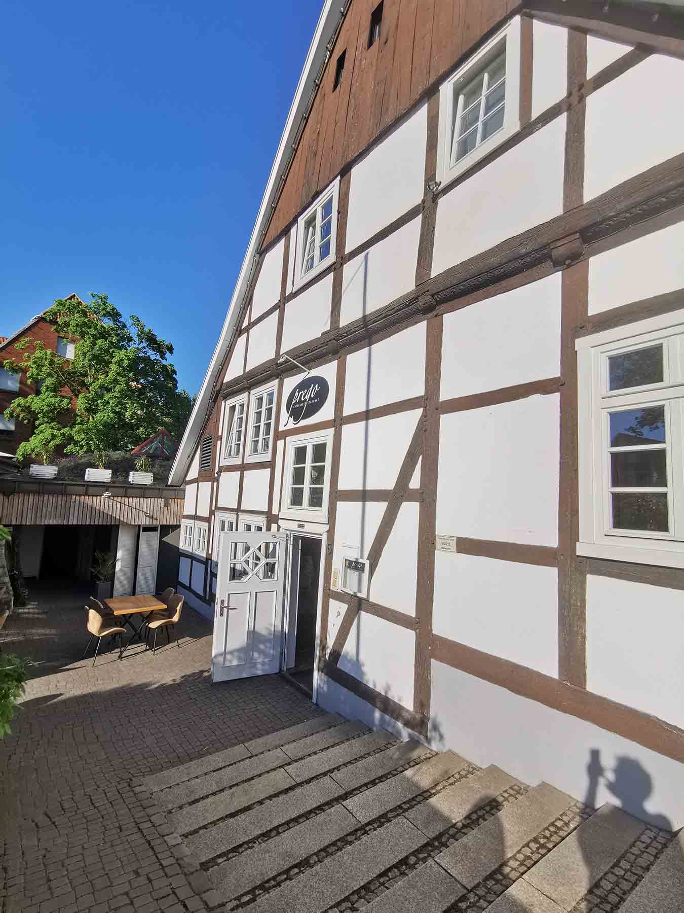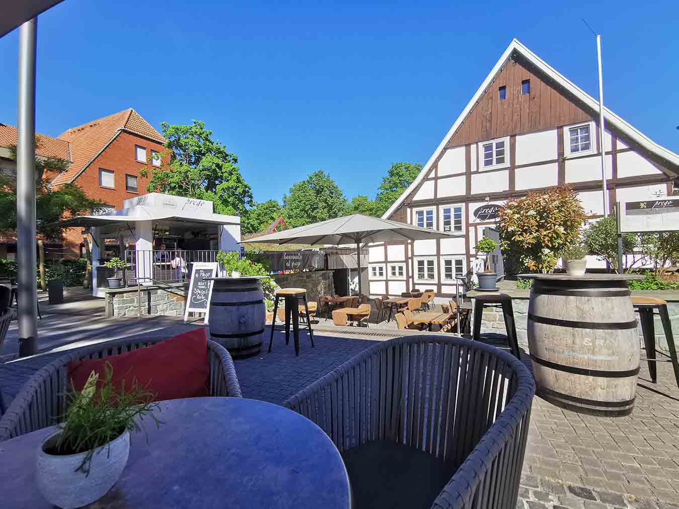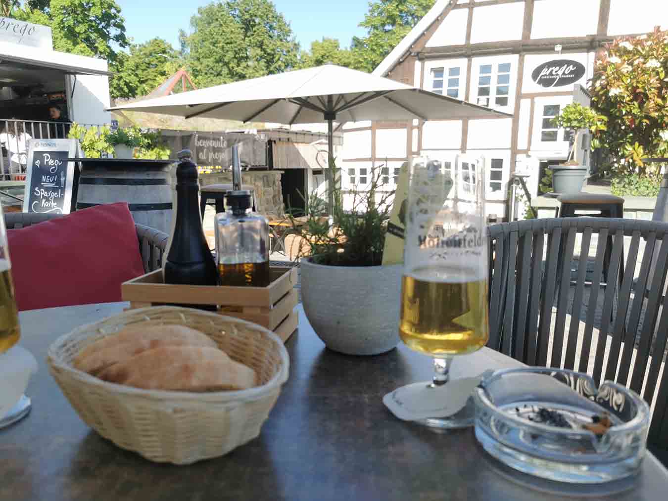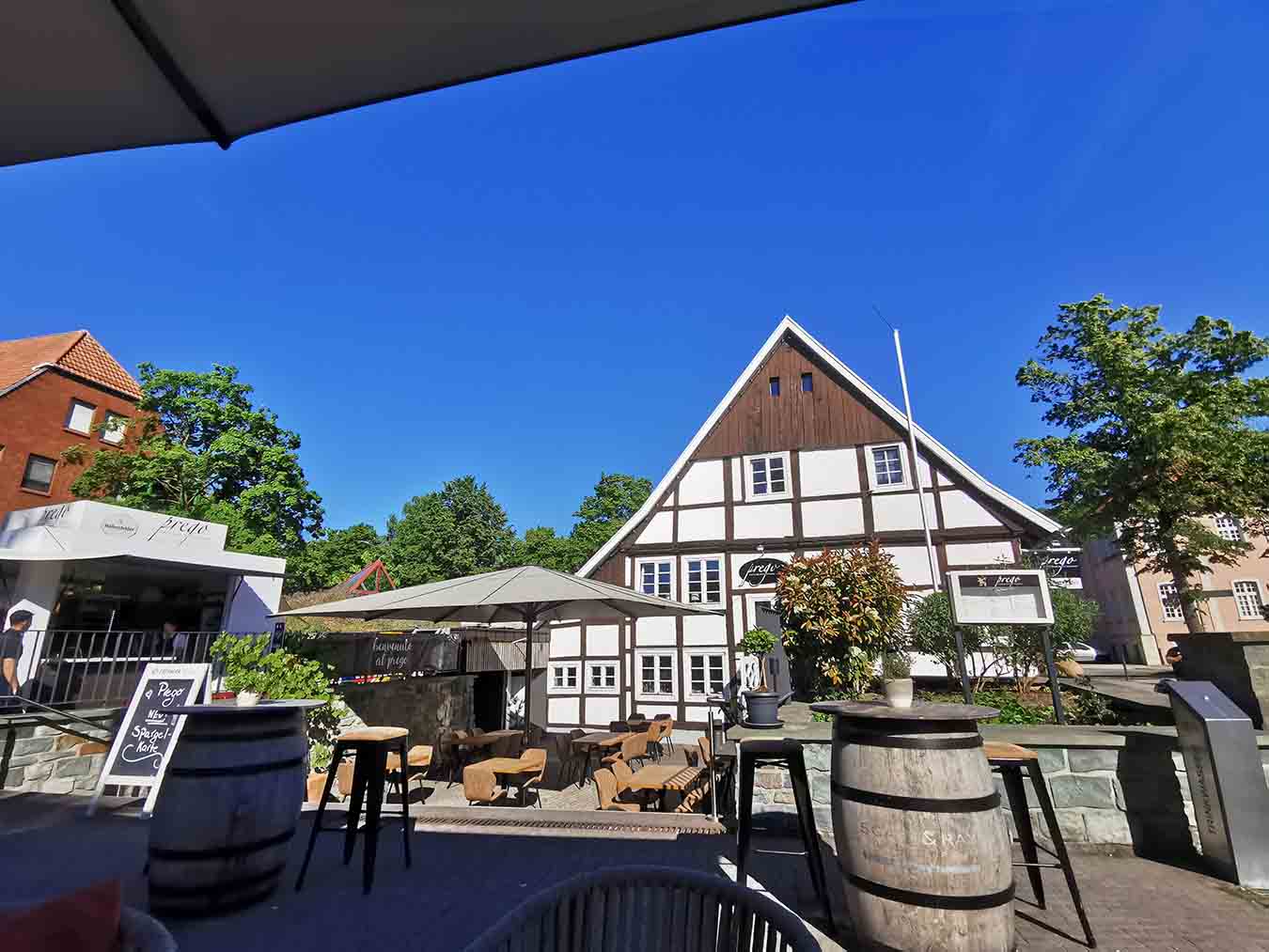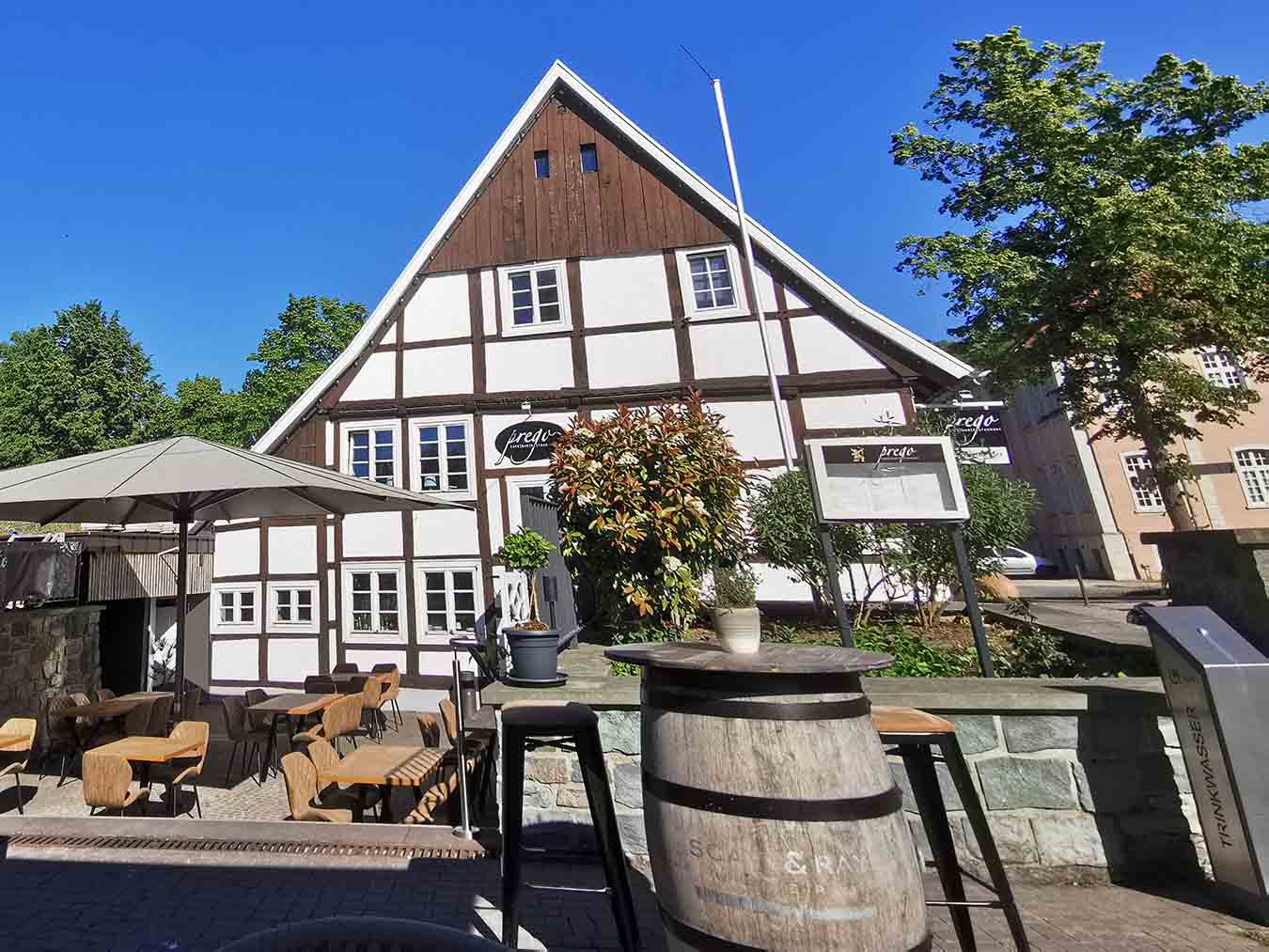 Gegen Abend, bei richtig warmen Temperaturen und nach einem langen Tag mit Schloss und Altstadt, kehrten wir ein – direkt gegenüber am Doktorplatz 5 in 33378 Rheda-Wiedenbrück. Das **Prego Restaurant | Café | Bar** hat uns mit seiner großflächigen Außenterrasse sofort eingefangen.