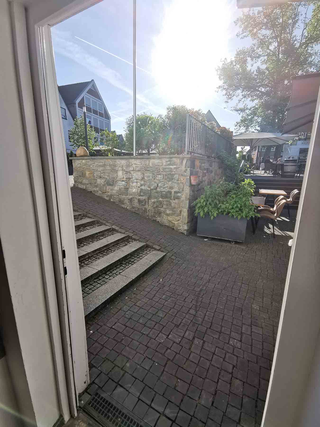 Wer nach drinnen oder zur unteren Terrasse möchte, steht vor einer Steintreppe… aber zum Glück gibt’s auch eine feste Rampe. Die ist allerdings ganz schön steil! Ich habe die Stützen an meinem Rollstuhl extra befestigt und war froh, dass wir zu zweit waren. Für Gehbehinderte und Rollator-Fahrer würde ich wirklich eine Begleitperson empfehlen. Aber: Die Betreiber haben daran gedacht – Respekt! 👍
